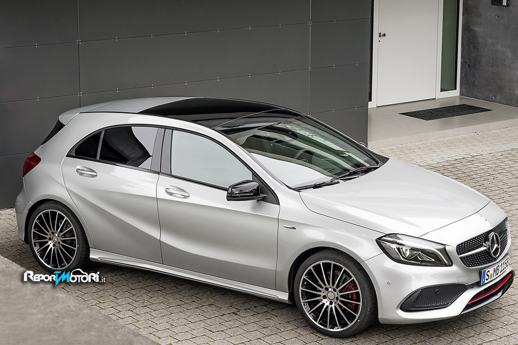 Le linee espressive, le curve dinamiche e il design dei finestrini in stile coupé definiscono il design degli esterni della Classe A, inserendosi nella filosofia di un design ispirato a una linearità accattivante. Il nuovo paraurti anteriore, dal profilo più affusolato, si ispira chiaramente alle forme del prototipo Concept CLASSE A (2011). Con mascherina del radiatore Matrix, nuovi fari LED High Performance (a richiesta; di serie per la A 45), gruppi ottici posteriori ridisegnati e terminali di scarico integrati nel paraurti, la nuova generazione mette in risalto la sportività e il dinamismo di questa fortunata serie della classe delle compatte.