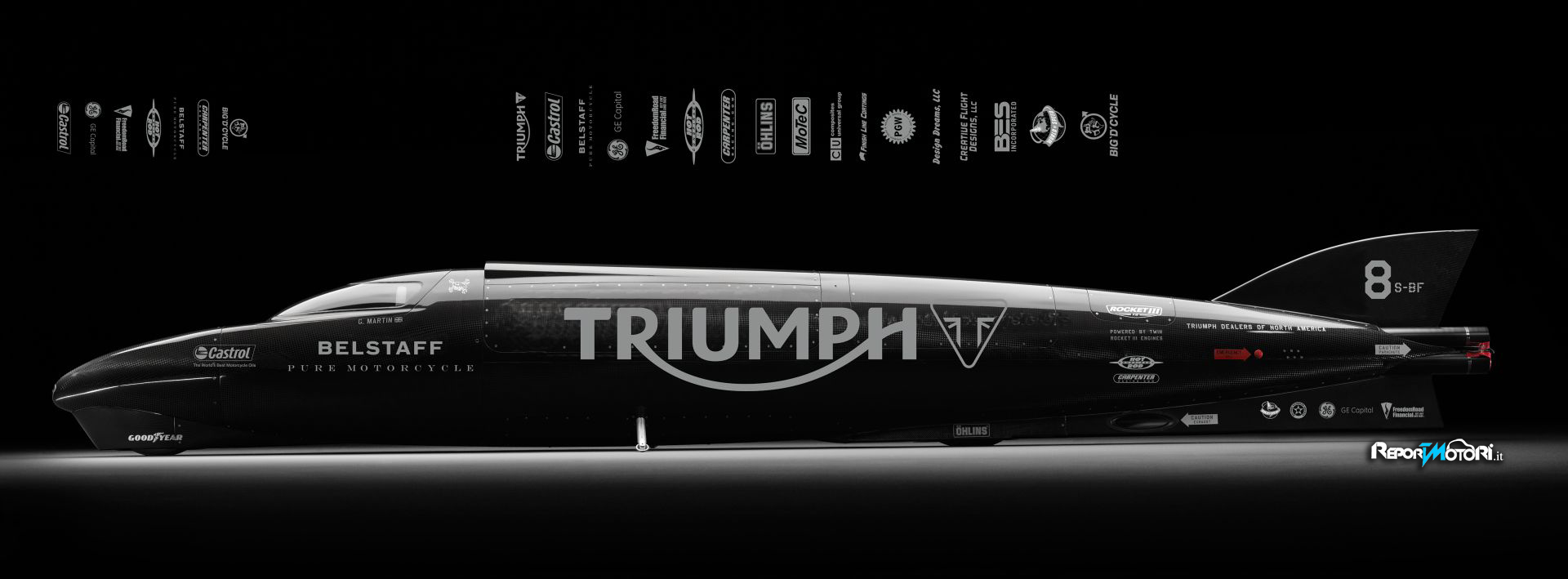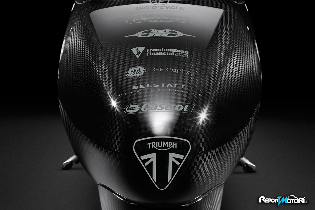 Lo streamliner Triumph del 2015 è una motocicletta lunga 7,77 metri, larga appena 60 cm e alta 91 cm, progettata appositamente per tentare di superare il record di velocità su terra nella divisione C della categoria FIM. Un “missile” composto da una monoscocca in carbon Kevlar e dotato di due motori turbocompressi alimentati a metanolo, derivati dalla dotazione di serie della Triumph Rocket III, in grado di generare una potenza complessiva di 1.000 CV a 9.000 giri.