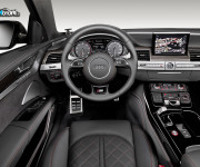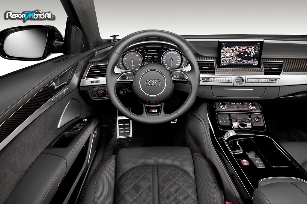 Gli inserti superiori sono in carbonio, quelli inferiori in alluminio spazzolato. Il selettore del cambio tiptronic e la consolle centrale sono rivestiti in lacca lucida nera. Caratteristici dei modelli S sono gli strumenti a fondo grigio, gli indicatori bianchi con movimento all’avviamento e logo S8 al tachimetro. Pedali e appoggio per il piede sinistro sono in acciaio. Il bottone per lo Start/Stop è contornato da un anello rosso e il logo S8 è presente anche sul volante sportivo in pelle a tre razze.