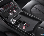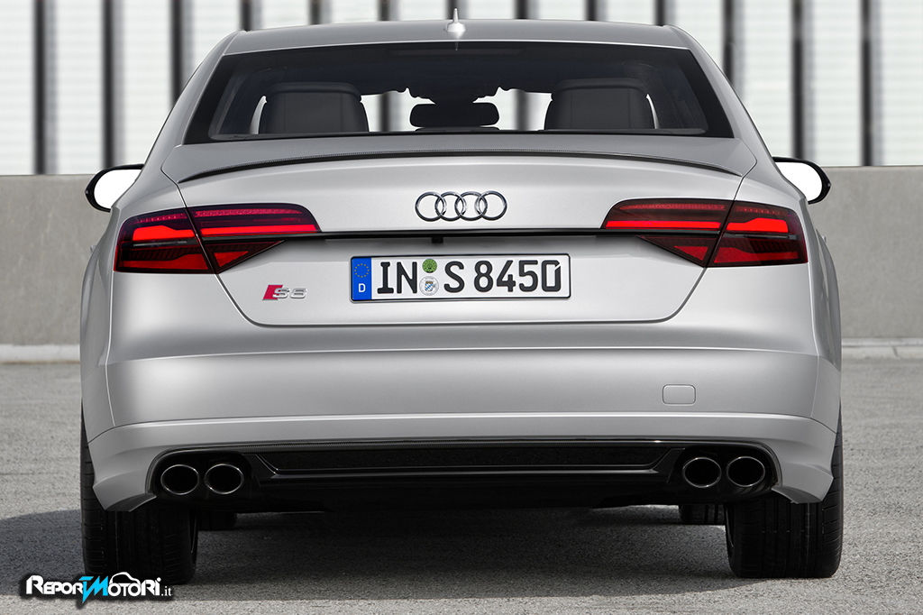 È nei dettagli che la nuova S8 plus rivela la sua posizione di modello sportivo al top della gamma Audi. Lo spoiler sul terzo volume cattura lo sguardo, ed è disponibile verniciato in colore carrozzeria o, in opzione, in fibra di carbonio. I listelli nelle prese d’aria laterali e lo splitter anteriore sono anch’essi in carbonio. I gusci degli specchietti retrovisori esterni in colore carrozzeria sono disponibili anche in nero lucido o in carbonio. Il single frame e i doppi listelli sono in nero lucido, mentre la struttura a nido d’ape delle prese d’aria laterali e delle coperture dei radiatori sono in nero opaco. Le modanatura ai finestrini laterali e al posteriore sono nere. Caratteristiche distintive della S8 plus includono anche luci posteriori oscurate e inserto diffusore in nero lucido, con un profilo addizionale in carbonio. Il doppio scarico sportivo sfocia in due terminali ovali, a sinistra e a destra. In alternativa i Clienti possono scegliere di mantenere l’estetica della S8.