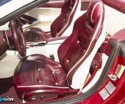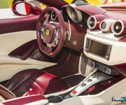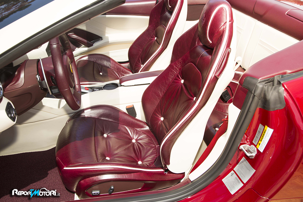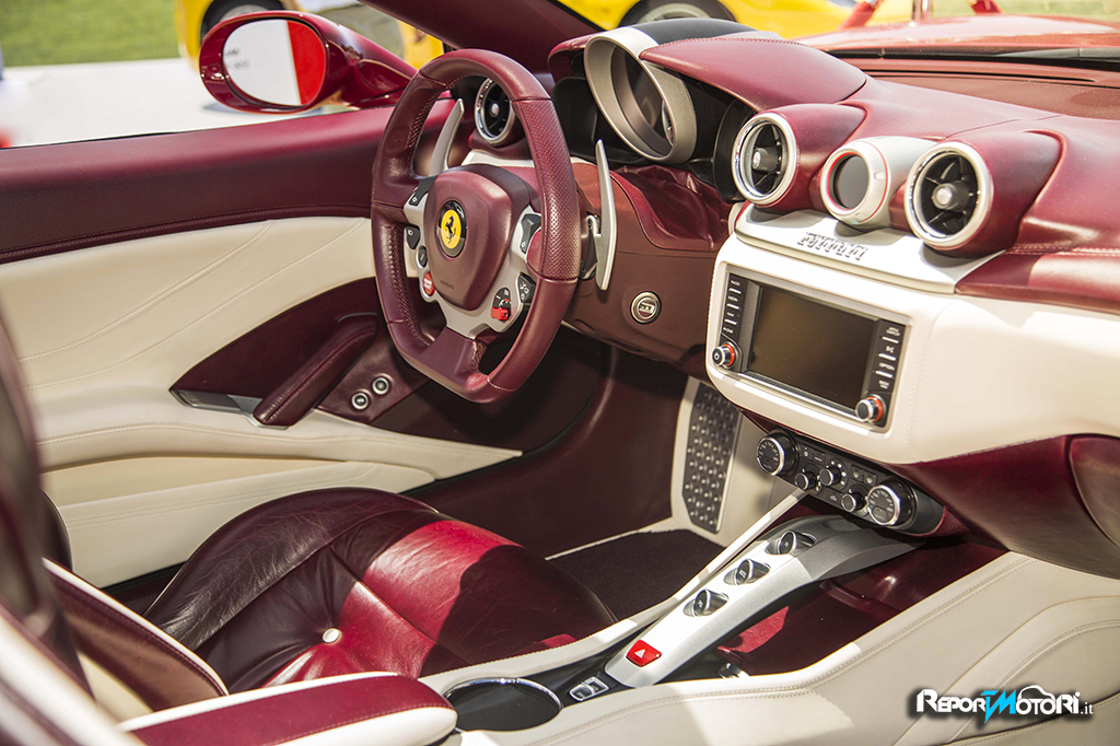 Ma sono soprattutto i lussuosi interni, scelti con la massima cura e attenzione al dettaglio, a rendere questa California T particolarmente ricca. Il programma Tailor Made prende spesso spunto dal mondo dell’Interior Design, e questa vettura illustra alla perfezione questo concetto: gli interni ricordano uno studio o una sala di lettura.I sedili in pelle bordeaux con inserti a diamante in pelle avorio richiamano una icona del design, la sedia Dezza di Giò Ponti. La calda e tradizionale opulenza delle pelli è contrapposta alle cromie lucide della plancia e del bridge centrale. Anche il volante è rifinito in pelle rosso bordeaux, cosi come parte dell’interno delle porte e il cruscotto.