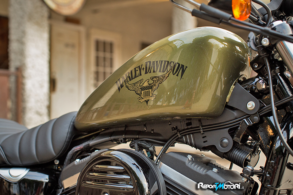 La Iron 883 2016 è disponibile in quattro colorazioni: Charcoal Satin, Black Denim o Olive Gold, con il logo dell’aquila e con lo scudo sul serbatoio, oppure Hard Candy Custom Gold Flake con dettagli a fiamme abbinato ai parafanghi neri.
