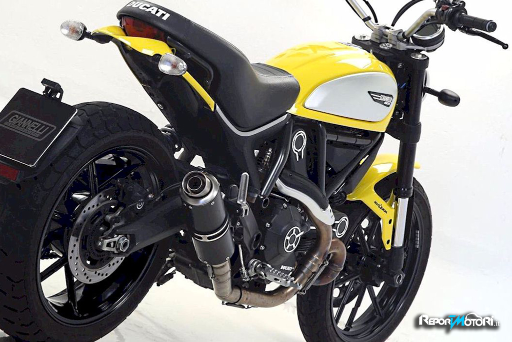 Dalla mitica Giannelli arriva per la nuova Ducati Scrambler il silenziatore X-Pro, uno finale slip on ( si monta sul collettore originale ) dotato di DB-Killer e struttura in acciaio con corpo nero .