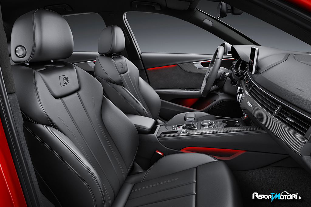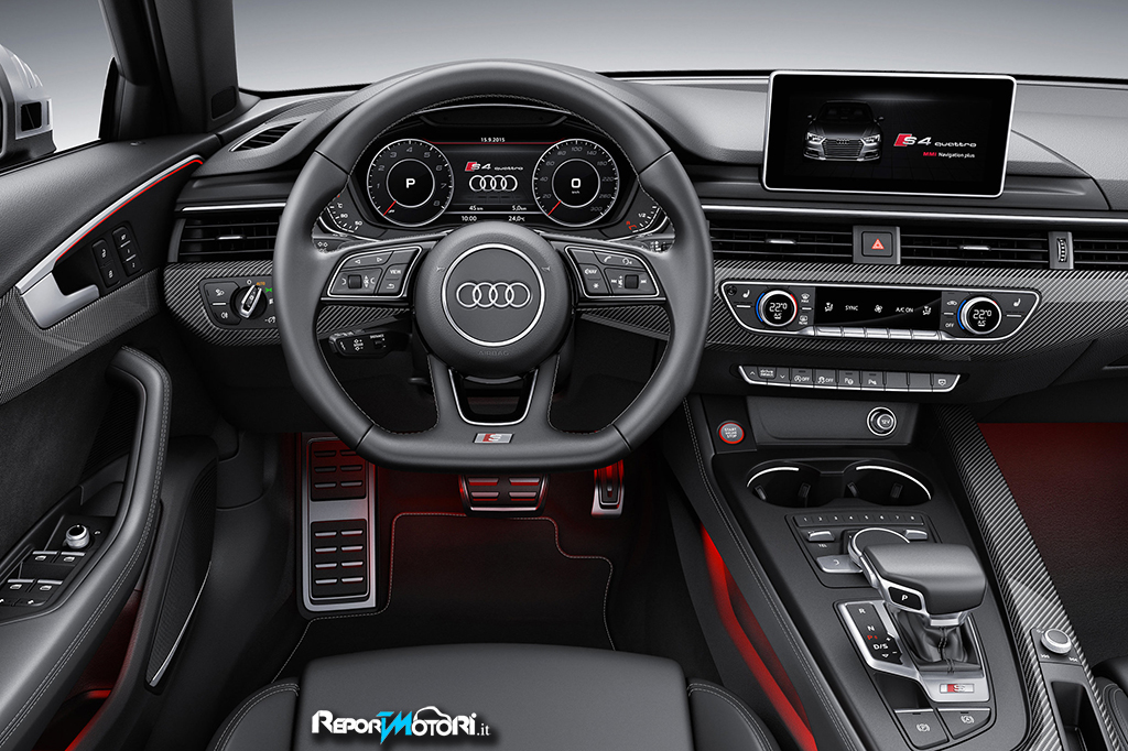 Grande attenzione per gli interni , sulla nuova Audi S4 , è disponibile l’Audi Virtual Cockpit , una novità assoluta che consiste nella strumentazione interamente digitale del cruscotto visualizza sotto forma di grafici dettagliati tutte le informazioni importanti su un display ad alta risoluzione da 12,3 pollici. Il guidatore può scegliere tra tre modalità di visualizzazione, una delle quali è una schermata sportiva esclusiva con il contagiri al centro.