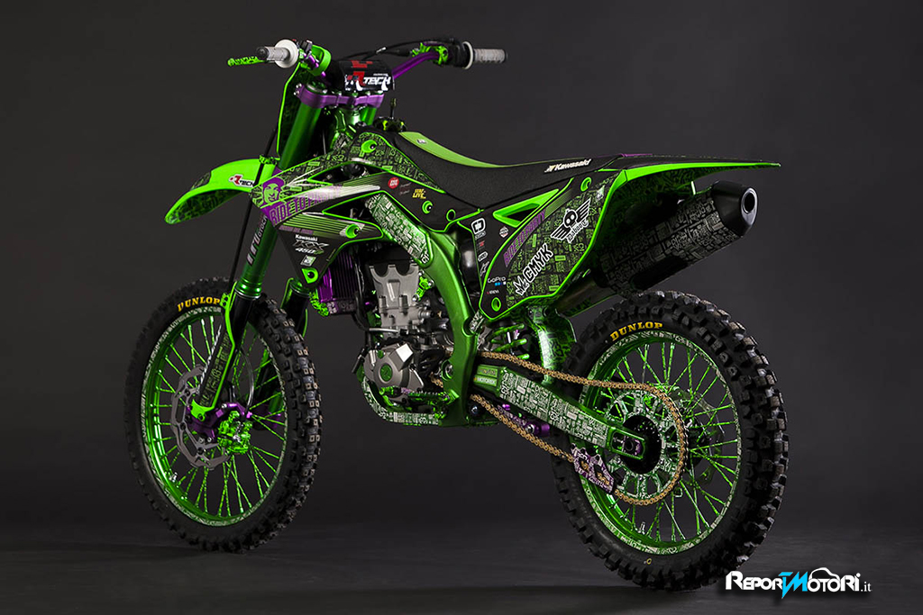 Lo studio grafico e progettuale ha inizialmente ripreso la mia vecchia KX del 2006; poi però mi sono focalizzato sul dare qualcosa di nuovo, fresco e mai visto. Per questo ho scelto di seguire la linea factory con i colori originali verde e nero, dandole però una nuova chiave di lettura. Per fare questo e per non renderla troppo standard ho voluto abbinare il viola, colore sempre utilizzato da Kawasaki nel passato e colore a me familiare, che dà uno stacco e si abbina bene agli altri due colori.