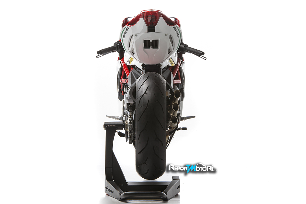 Pesa solo 173kg ed ha un telaio che rappresenta il vero know how della MV Agusta , un telaio a traliccio di tubi di acciaio e piastre laterali in alluminio , un monobraccio lungo 576,5 millimetro ed un interasse di soli 1.380 millimetri, numeri che la dicono sulla sull’agilità e stabilità di una moto altamente prestazionale.