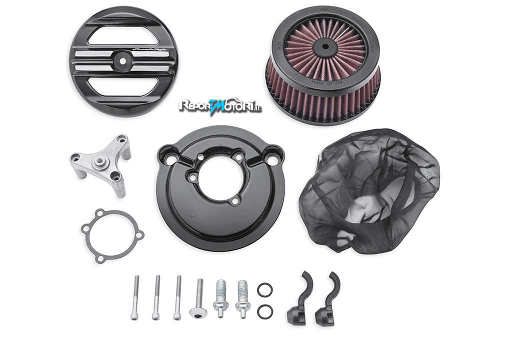 – Kit filtro dell’aria Screamin’ Eagle, derivato dal mondo delle corse, fornisce un volume d’aria più ampio senza alcun limite , grazie alla superficie maggiorata . Il kit comprende la staffa di posizionamento , la custodia impermeabile e la bulloneria dedicata. Prezzo al pubblico 385 euro ;