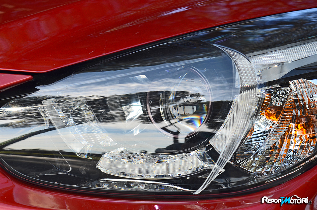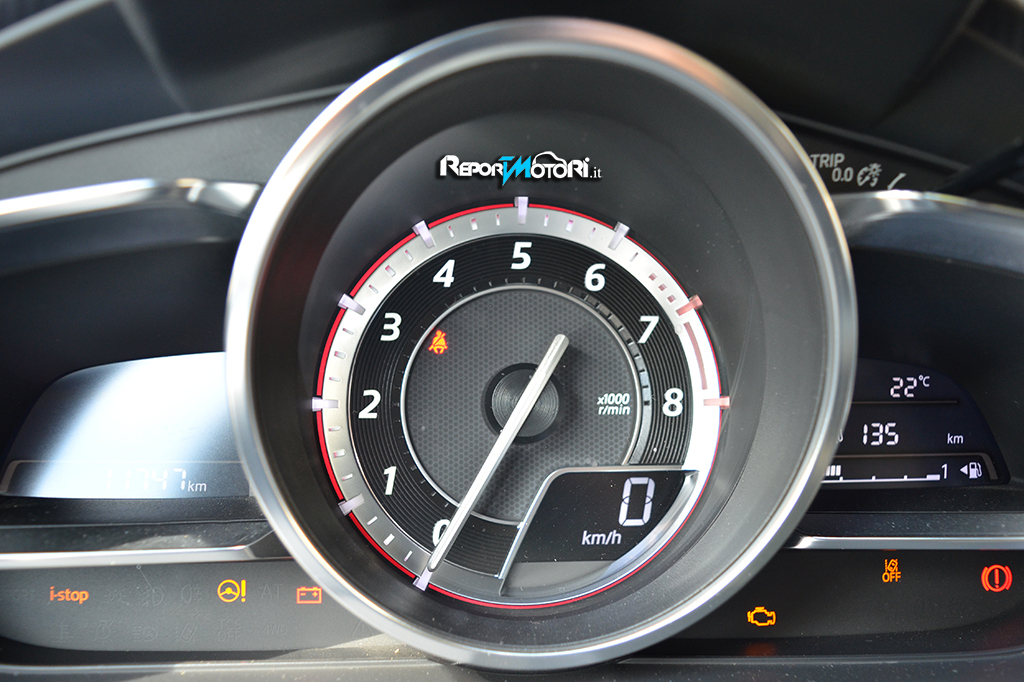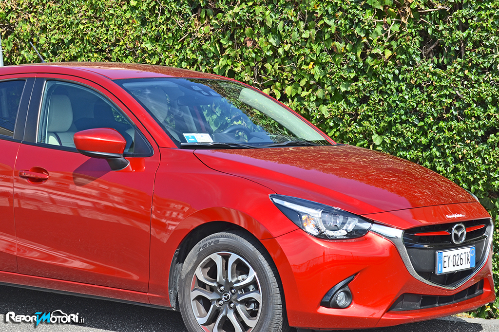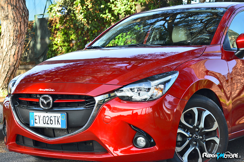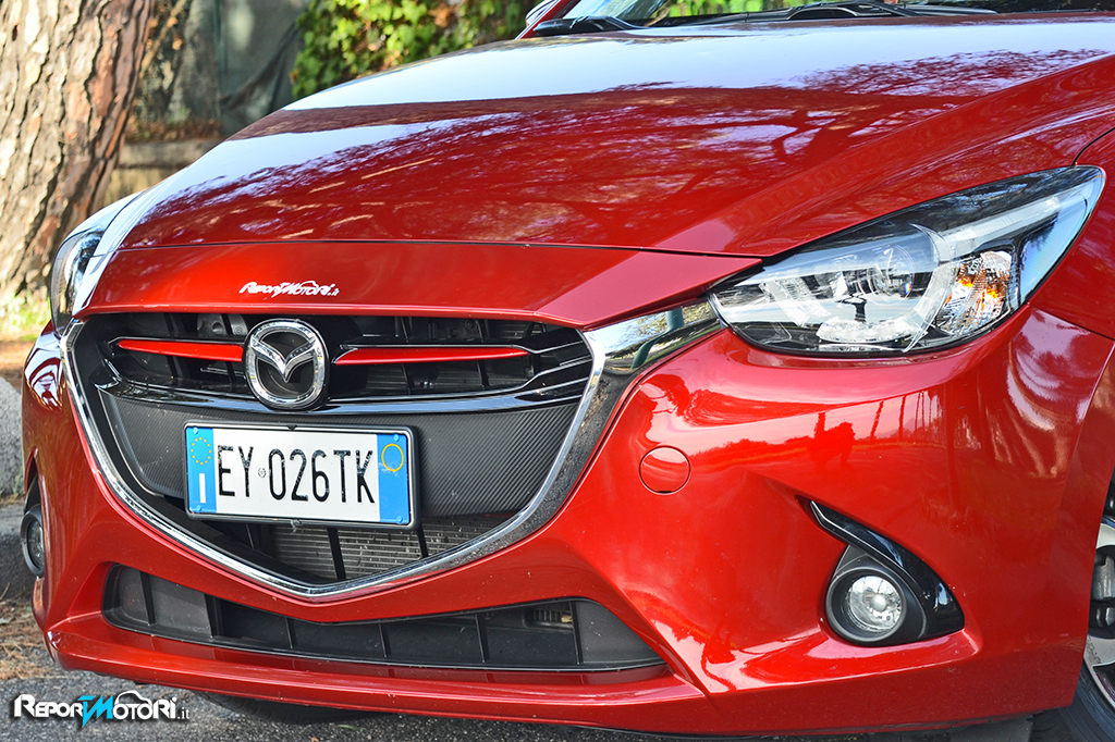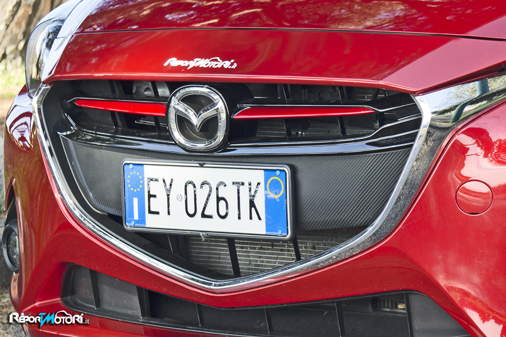 Più in basso troviamo i due “ minacciosi “ fendinebbia , che sono incastonati in una cornice scura, e separati da una vistosa bocca : l’impronta sportiva sulla Mazda 2 è evidente sia esteticamente che nell’abitacolo .