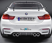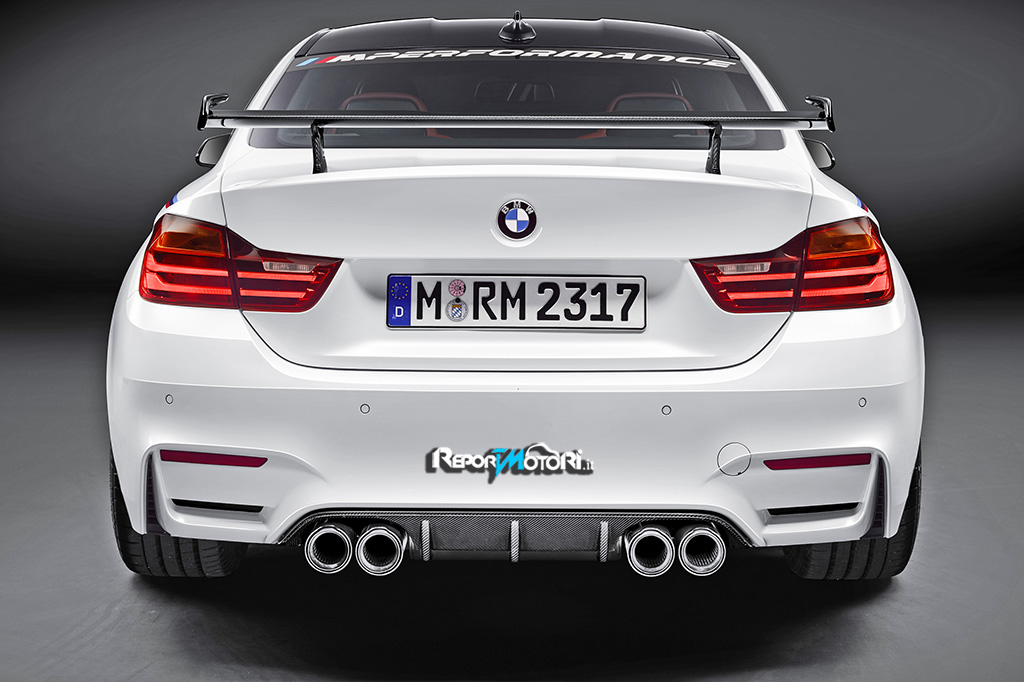 Il nuovo impianto di scarico è realizzato per dare risalto e sonorità al potente motore della BMW M4 Coupé : i collettori in acciaio inox si uniscono a silenziatori realizzati interamente in titanio , ” uscite ” che riportano il bellissimo e nuovo logo M Performance .