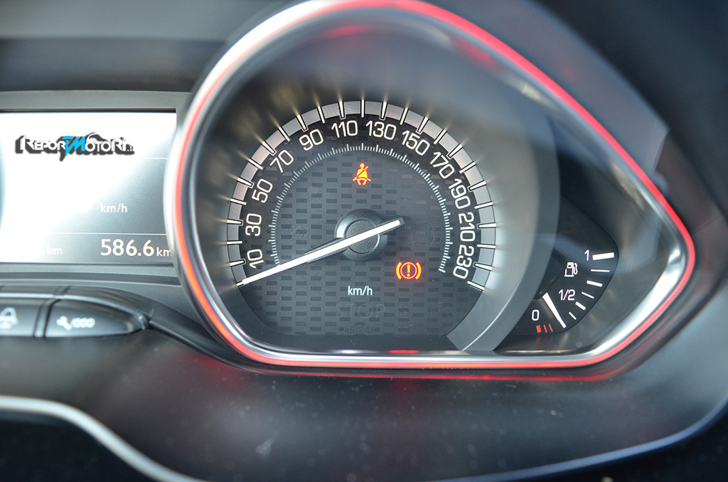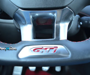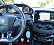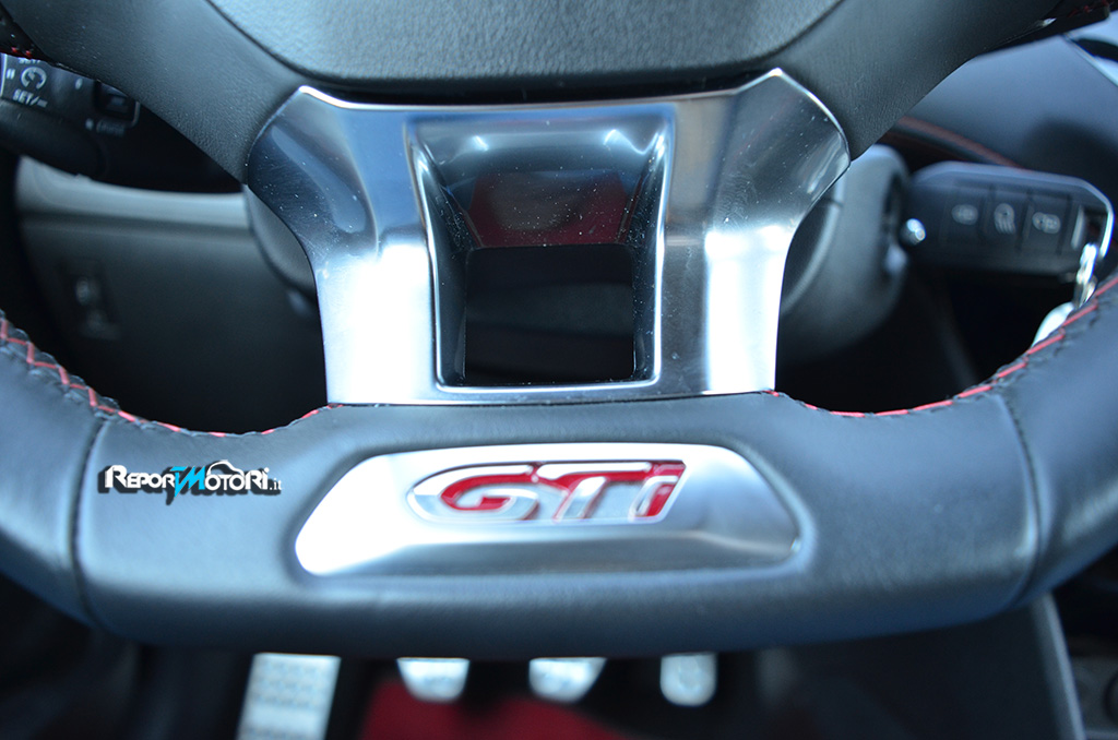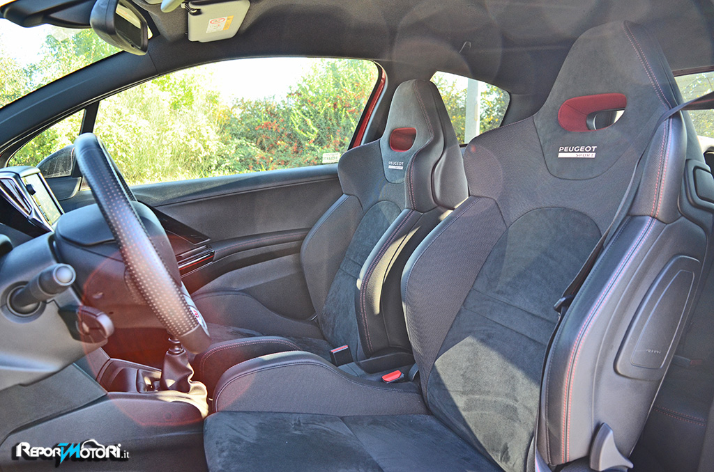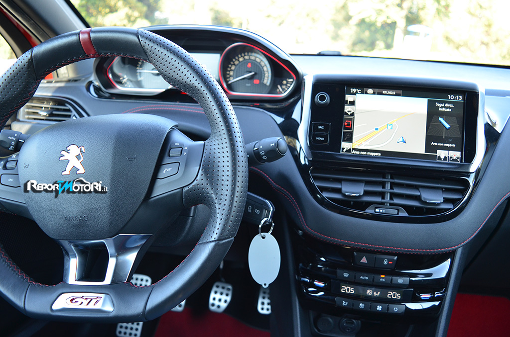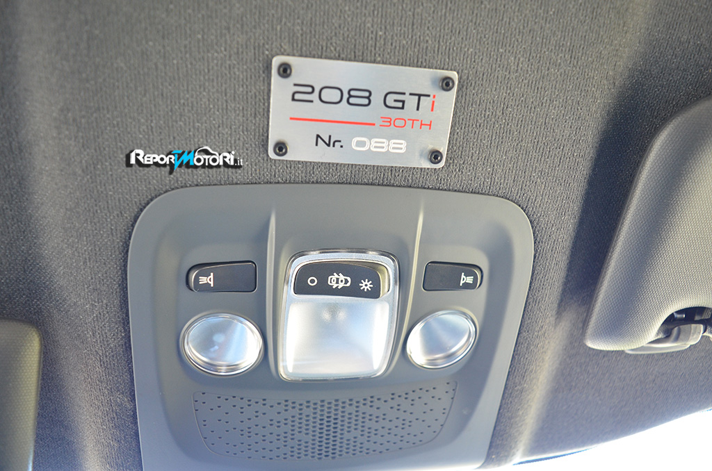 Sedili sportivi dall’eccellente profilatura , volante rivestito in pelle dalle dimensioni ridotte con tanto di logo GTi , tappetini rossi e plancia interamente rivestita con cuciture rosse a vista : non è una vettura da corsa , bensì l’interno della Peugeot 208 GTi 30th !