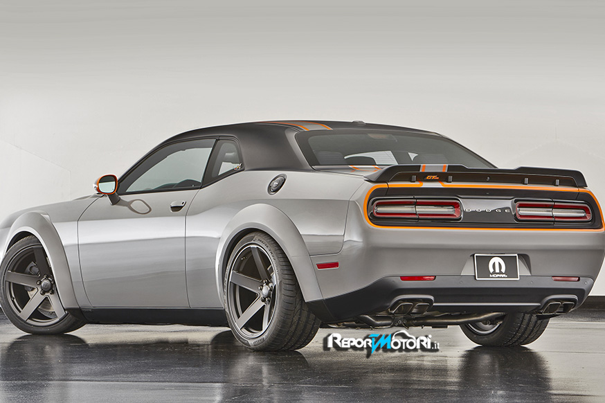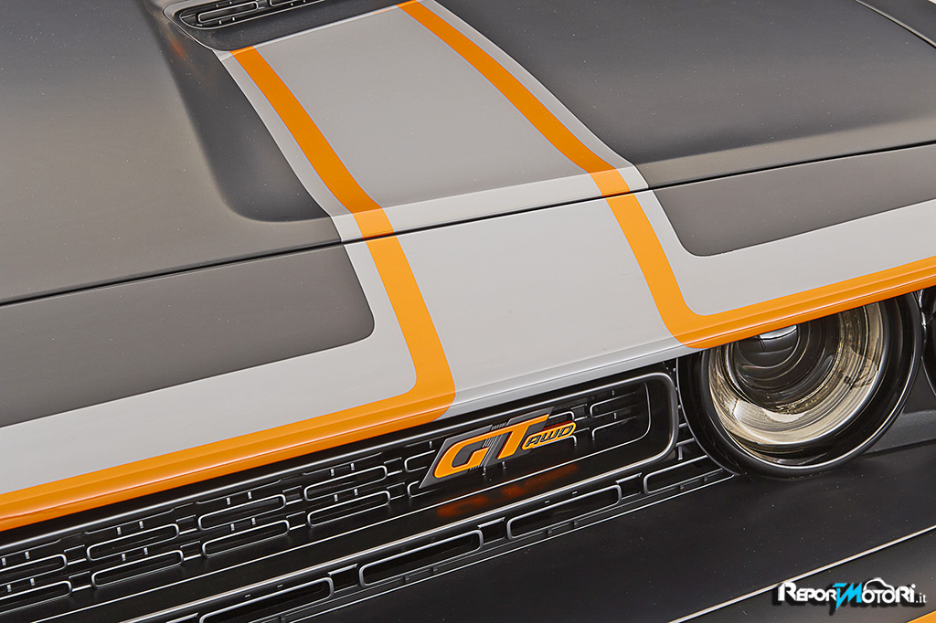 Diversi gli interventi che Mopar ha effettuato per rendere unica la Dodge Challenger GT AWD Concept : dalla griglia anteriore alla tinta Header Orange che grazie ad una vernice Matte Black, inebria la muscolosa carrozzeria con una tonalità unica .