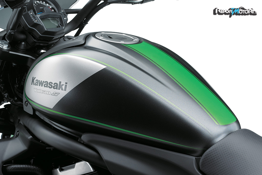 La grafica del serbatoio contraddistingue la nuova Kawasaki Vulcan S Special Edition 2016, un look che richiama quelle delle massicce moto americane così come le strisce verdi adesive sui cerchi.