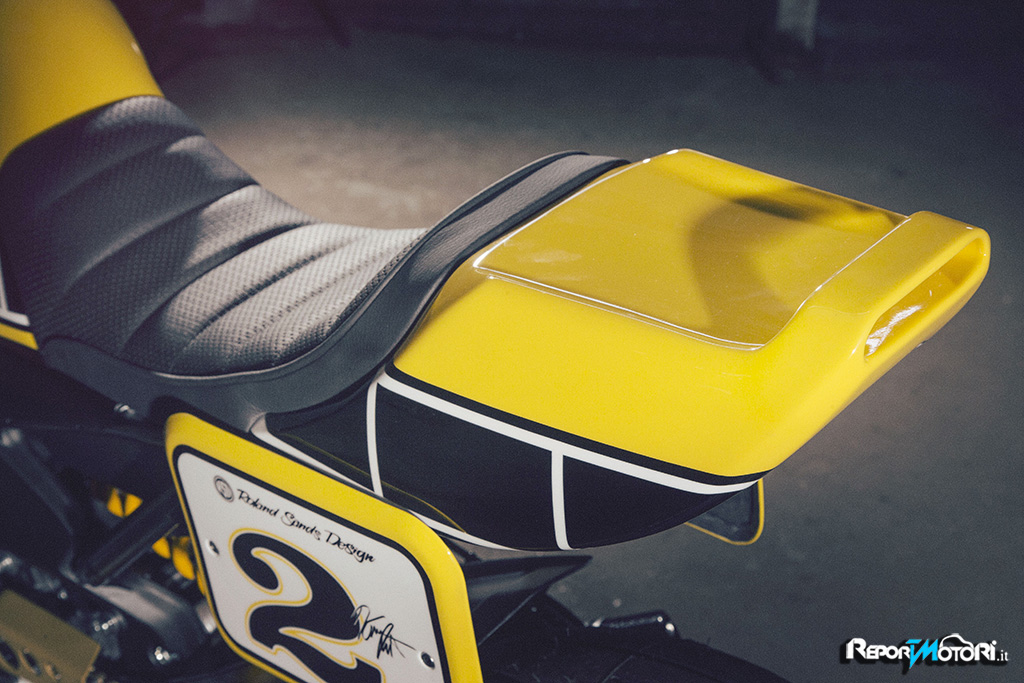 La Faster Wasp firmata Roland Sands si ispira alla leggendaria e mitica TZ750 da dire track ed ha una livrea inconfondibile, quella giallonera color calabrone , quella con cui Kenny Robert negli anni 70 conquistò il mondo intero !