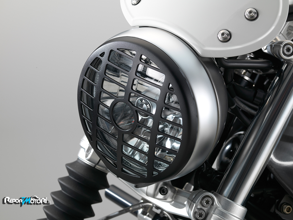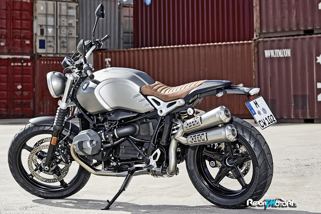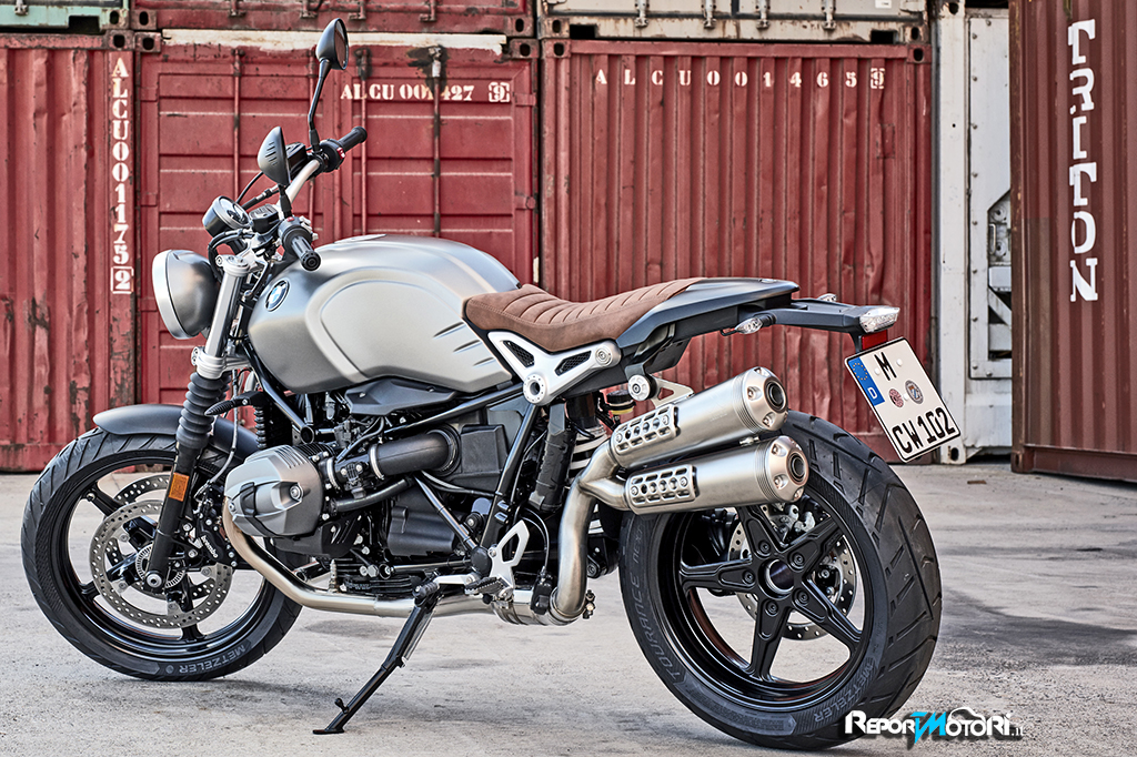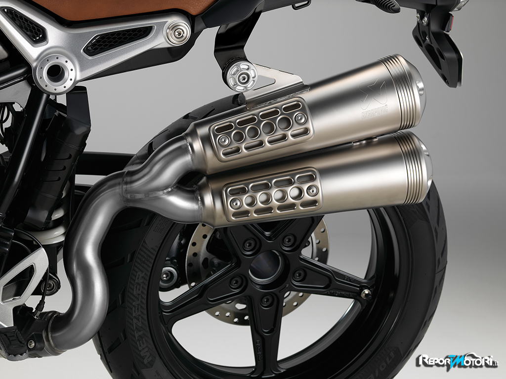 L’impianto di scarico della BMW R nineT Scrambler emette una sonorità piena, i doppi terminali sovrapposti sono il simbolo di una moda lanciata negli anni Settanta.