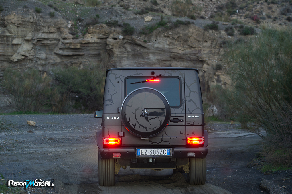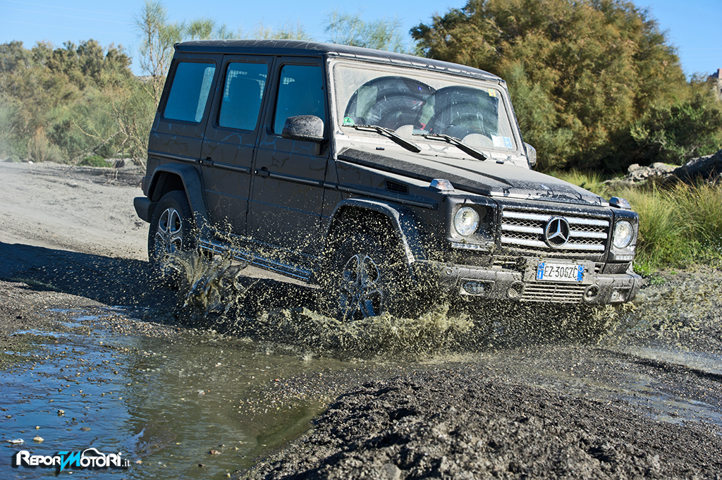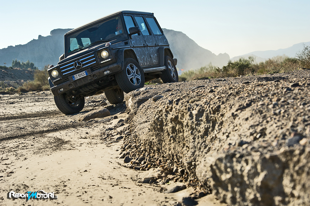Tra rocce e guadi, la Classe G è perfettamente a suo agio, le tre opzioni per il blocco del differenziale, assicurano un aiuto elettronico non indifferente e la notevole altezza da terra permette di superare con estrema facilità un percorso tortuoso .