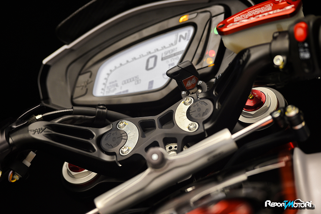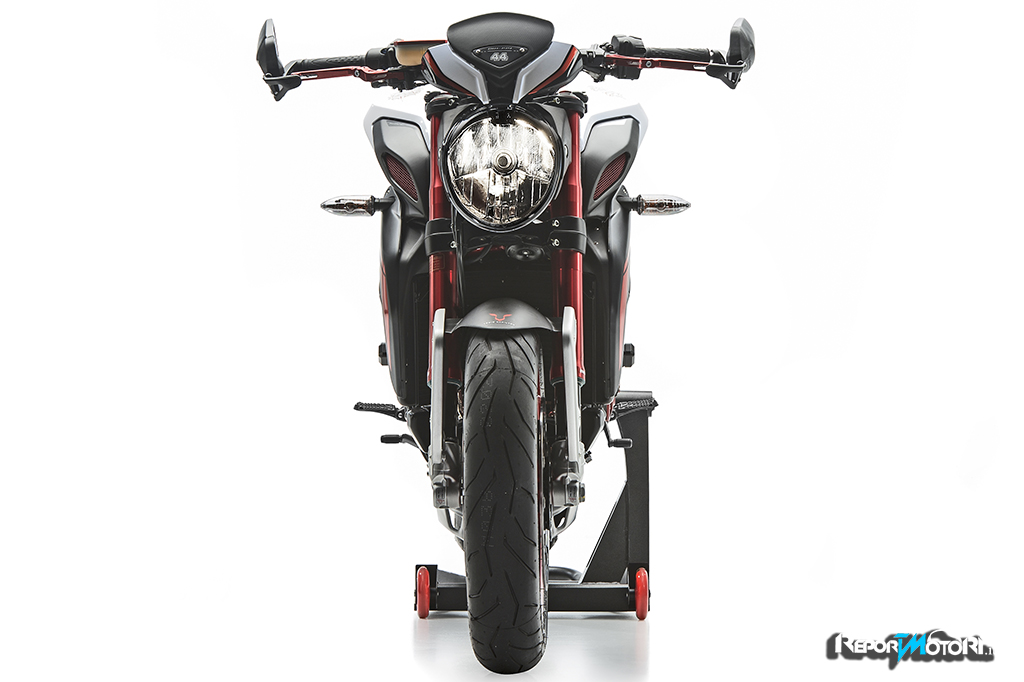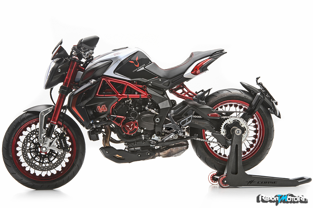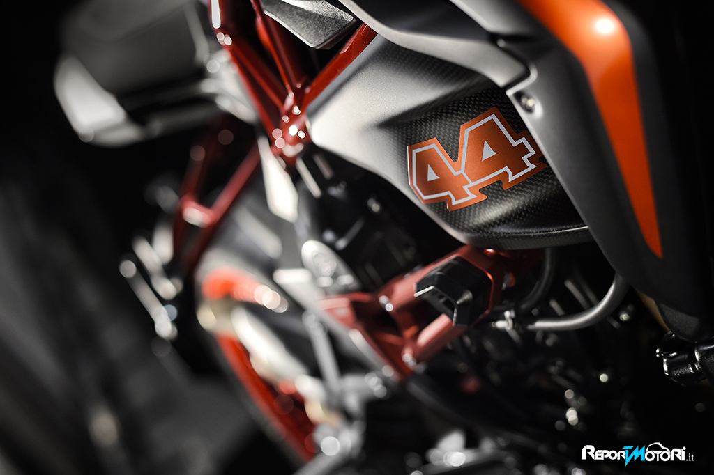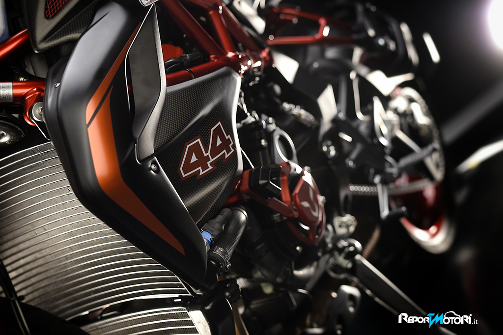 Il logo 44 campeggia sul frontale e lateralmente mentre il bianco perlato dona alla MV Agusta Dragster RR LH44 una cattiveria unica.