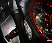 Tantissimi i particolari in fibra di carbonio, dai parafanghi, anteriore e posteriore, al cupoloni, ai convogliatori d’aria, alla protezione para-calore del silenziatore, il logo della pantera e la firma del pilota fanno bella mostra su di una moto dalla bellezza inaudita !