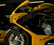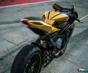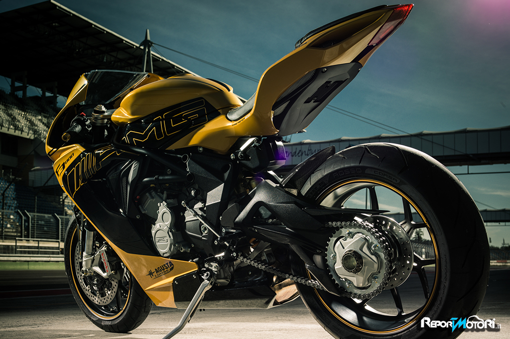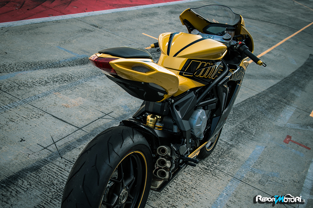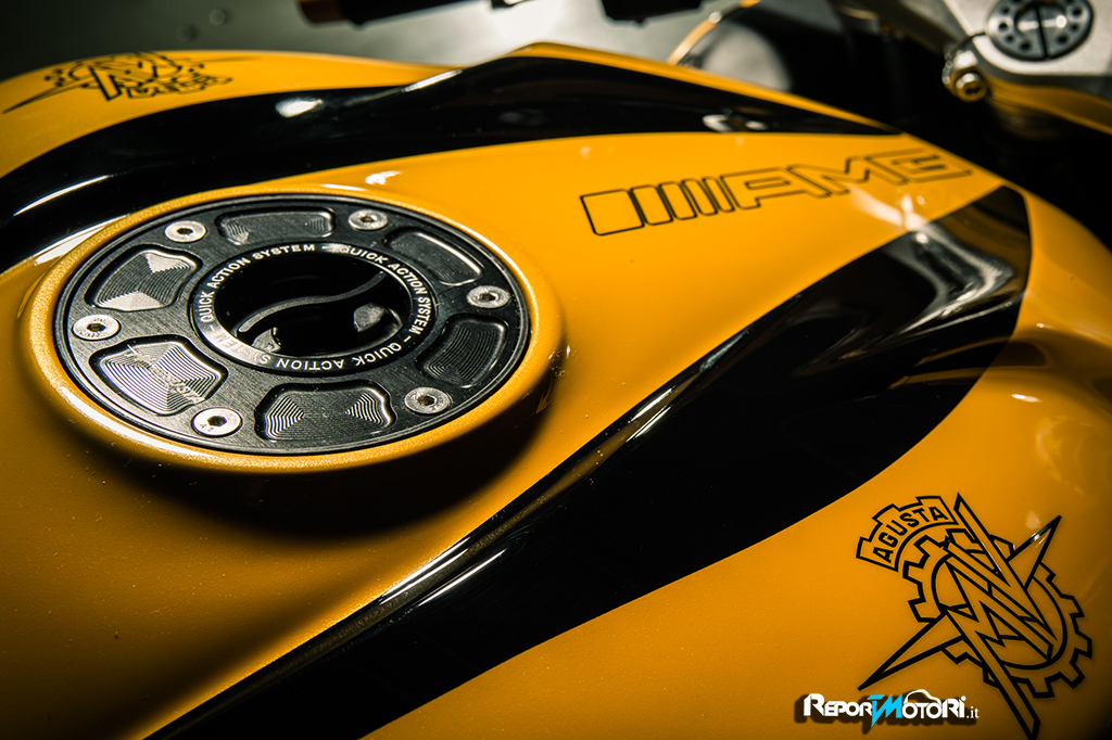 Diversi i particolari in carbonio, diversi i richiami al mondo racing presenti sulla F3 AMG , dal tappo serbatoio racing alle cuciture gialle poste sulla sella pilota e passeggero, la livrea ” Solar Beam ” attira l’attenzione !!!