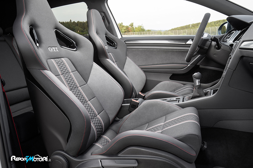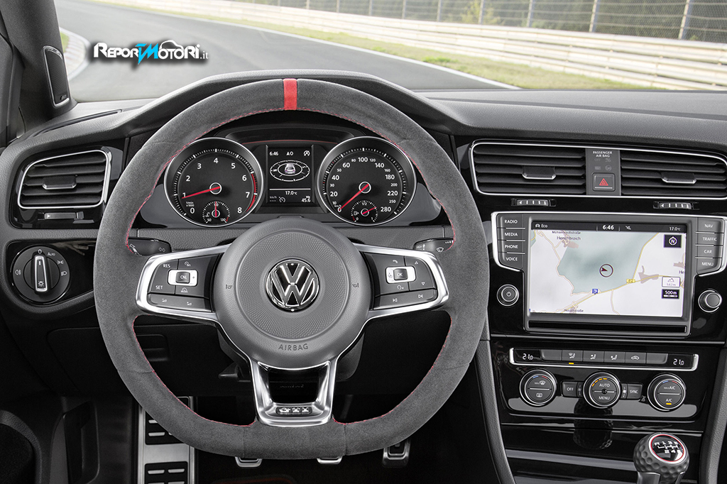 Internamente la Golf GTI Clubsport si caratterizza per il volante scamosciato, per i sedili profilati e per il tachimetro con fondo scala a 280 km/h .