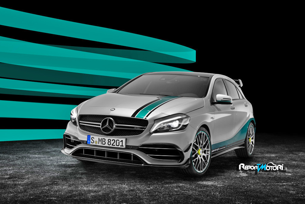 Ha una livrea che ricorda la vincente F1 W06 Hybrid, perché la carrozzeria della Mercedes AMG A 45 4Matic World Champion Edition è verde petrolio e nero e comprende un pacchetto aerodinamico aggressivo che prevede uno splitter e flap laterali ed uno spoiler sul tetto, di chiara impronta sportiva.