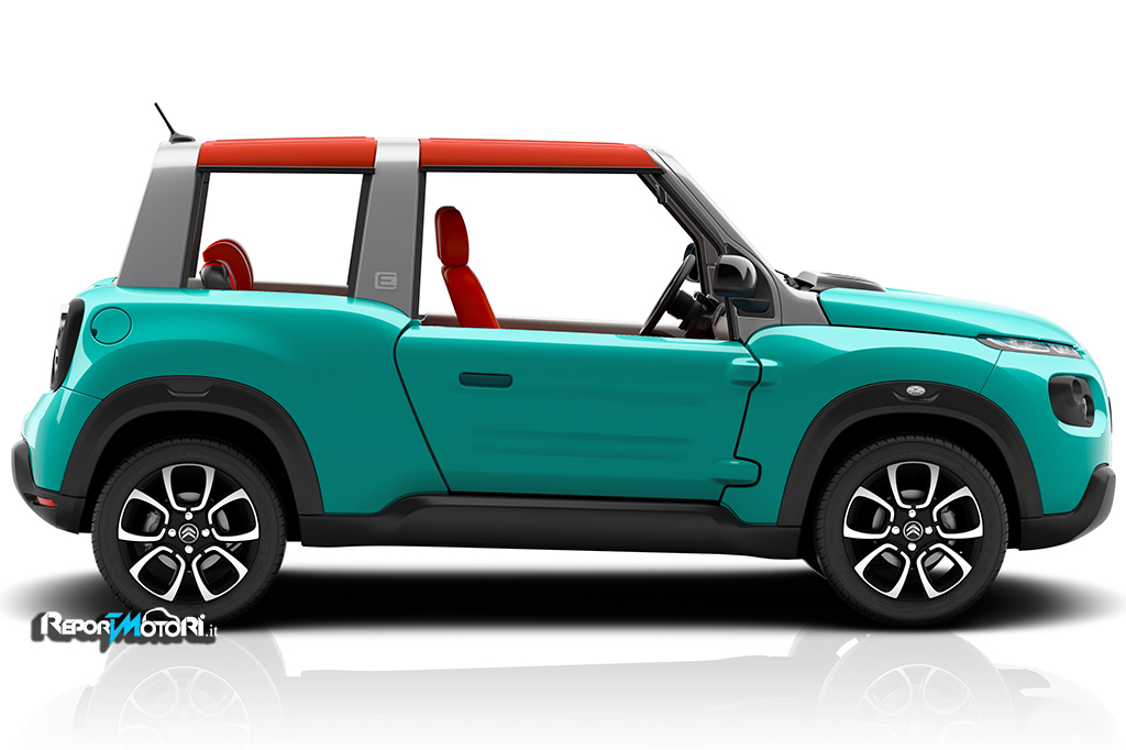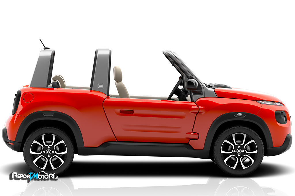 E’ decappottabile, la sua capote rimovibile ha un sistema laterale a scomparsa con vetrate trasparenti e grazie alla guida rialzata la Citroen E-Mehari si adatta perfettamente alla guida in fuoristrada.