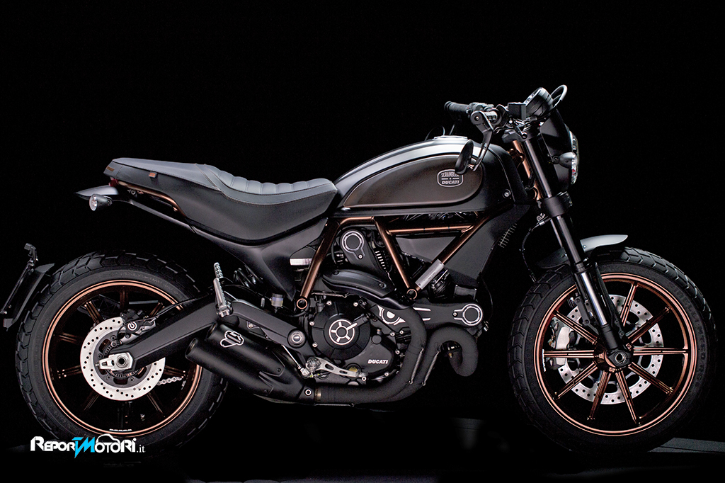 Motore nero con alette fresate e lavorazioni a vista, gruppo scarico completo nero con silenziatore Termignoni, manubrio basso a sezione variabile con specchietti retrovisori in alluminio montati all’estremità, sono solo alcuni degli accessori montati sull’esclusiva Scrambler .