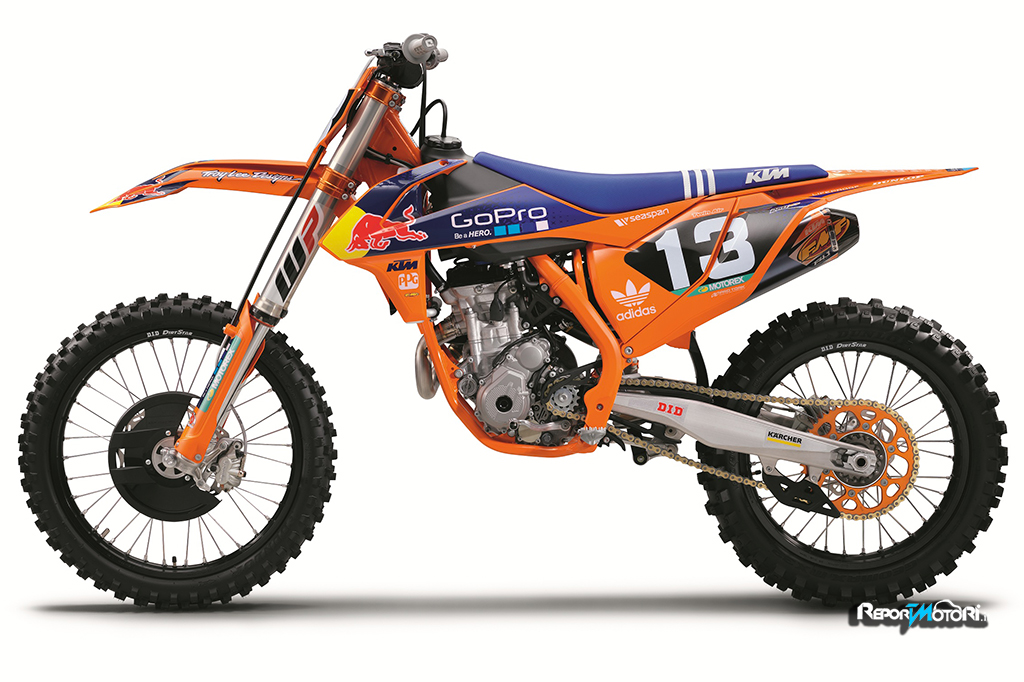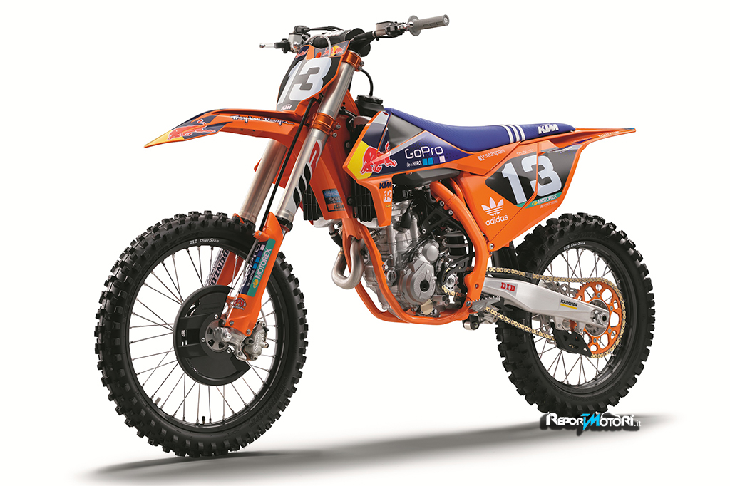 Le moto sono tutte equipaggiate con forcella WP AER da 48mm piastre di sterzo in alluminio ricavate dal pieno e anodizzate arancione così come la corona, silenziatori Akrapovič (450) e FMF (250), telaio arancione, copertura sella dedicata (Adidas per la 250, Selle Dalla Valle per la 450), cerchi neri D.I.D DirtStar, strumento conta ore, protezione freno anteriore, catena Regina Gold.