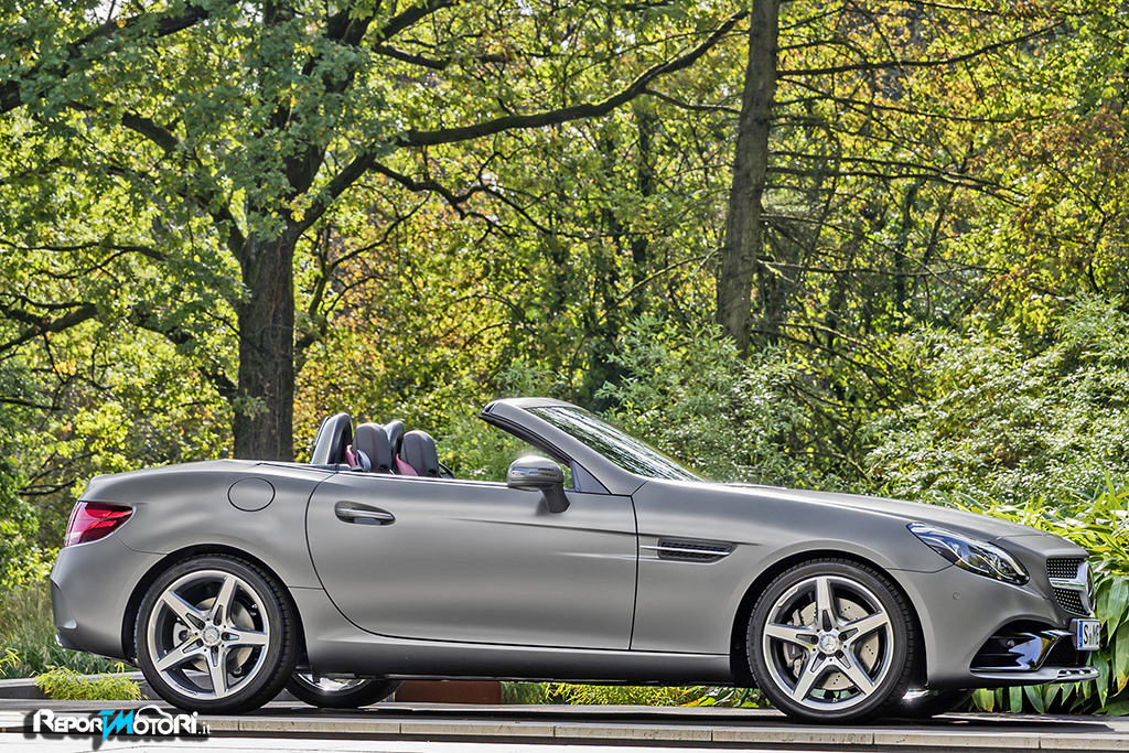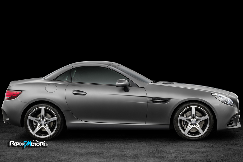 Lateralmente la nuova Mercedes SLC si caratterizza per una linea di cintura che scende progressivamente fino a mescolarsi con un design muscoloso ma elegante.
