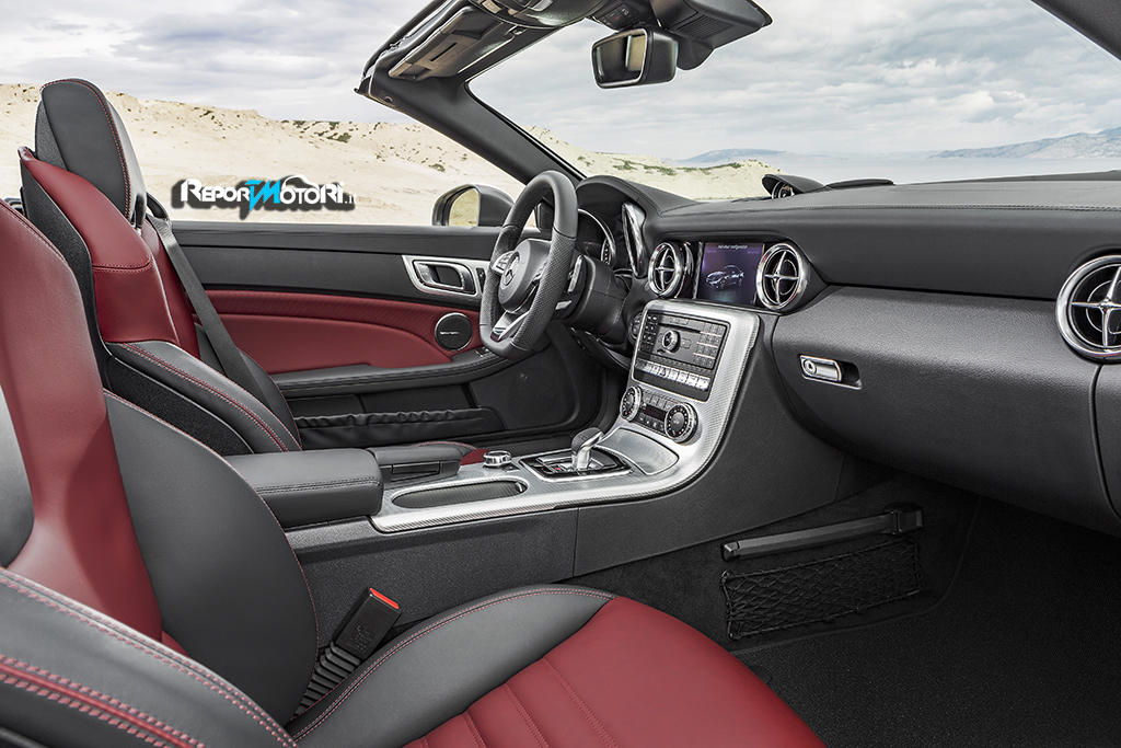 Modificare ed intervenire sugli interni della nuova “ SLC “ non era facile, ma in Mercedes sono intervenuti attraverso nuove finiture in carbonio chiaro e scuro ed a nuovi inserti in alluminio .
