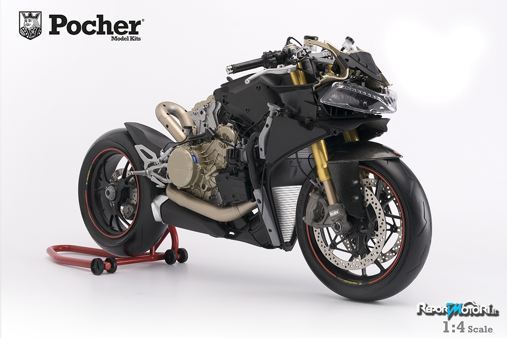 Pocher, che da sempre realizza pregiati modelli di auto in scala 1:8, esordisce nella scala 1:4 con un modello di alta fattura composto da 1055 parti della Ducati 1299 Panigale S, la moto che si distingue come la più emozionante Superbike del mercato per la sua superiorità tecnologica con un alesaggio da record di 116 mm, 205 CV di pura adrenalina e 115 Nm di coppia.