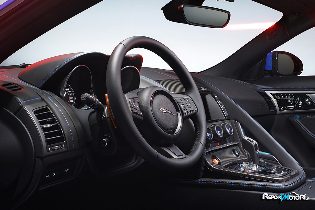 Internamente la Jaguar F-Type British Design Edition si caratterizza per la console centrale con rivestimento in fibra di carbonio, rivestimenti in pelle Jet e sedili con 14 regolazioni con marchio British Design Edition in rilievo sui poggiatesta .