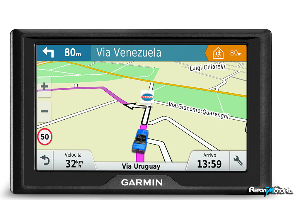 Infine, Garmin DriveAssist , con display “pinch to zoom” da 5 pollici, include tutte le caratteristiche del Garmin DriveSmart e aggiunge una Dash Cam integrata, ovvero una videocamera che permette di registrare automaticamente tutto quello che avviene sulla strada mentre si è al volante. Avviandosi con l’accensione del dispositivo, Dash Cam inizia a registrare a ciclo continuo, salvando i filmati su una micro SD e, in caso di incidente o di un semplice urto, proteggendoli da sovrascrittura. Prevede inoltre il sensore distanza di sicurezza, che avvisa il conducente qualora non stia rispettando la distanza di sicurezza dal veicolo che lo precede, il sensore di superamento corsia, in grado di leggere ed interpretare la segnaletica orizzontale e di avvisare il guidatore in caso di superamento accidentale della linea di corsia, e Real Vision che visualizza sul display l’avvicinarsi alla destinazione selezionata, mostrandola in visione reale e segnalandola con una freccia.