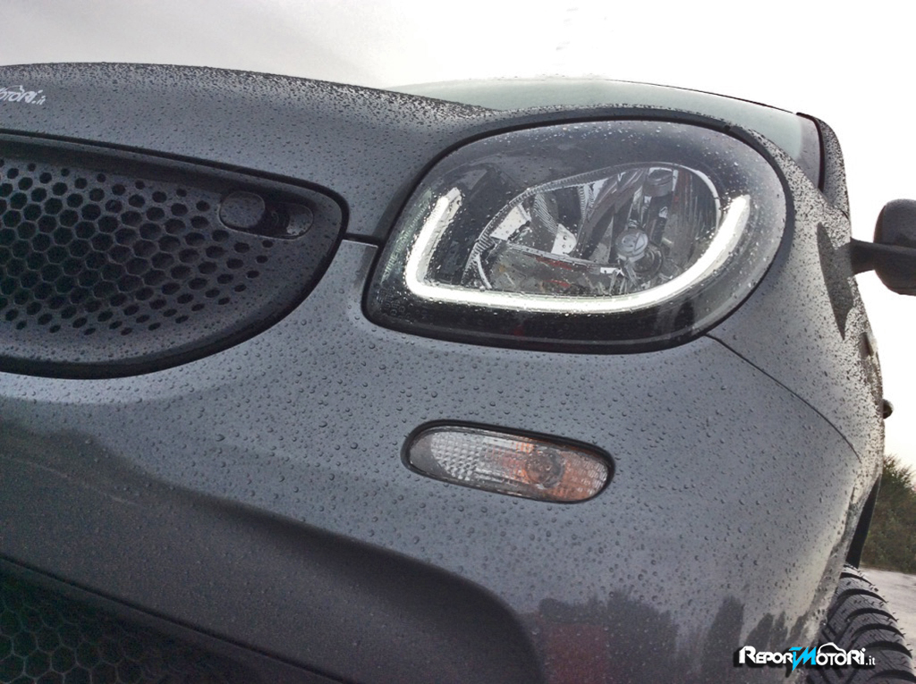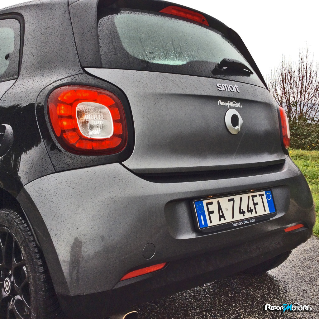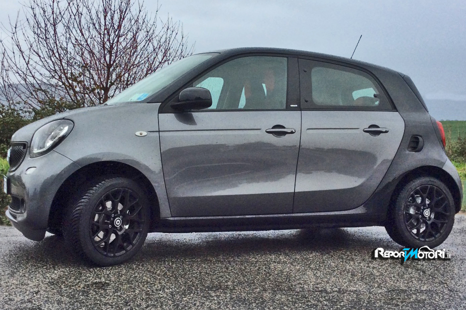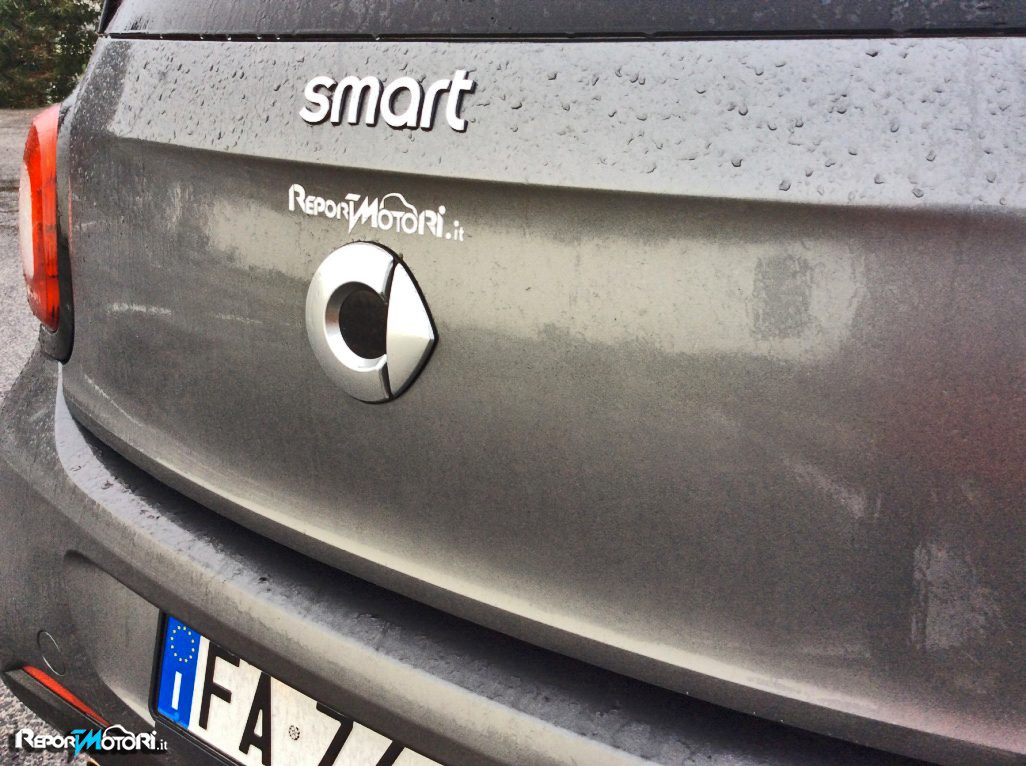 Proporzioni decisamente inusuali per la quattro porte smart perché ad un cofano anteriore decisamente alto e tagliato corrisponde una linea di cintura alta ed un notevole sviluppo in altezza del corpo vettura, del resto, l’obiettivo dei tecnici tedeschi era quello di aumentare l’abitabilità ed il comfort interno sfruttando al meglio i ridotti ingombri di un auto che non arriva a sfiorare i tre metri e mezzo di lunghezza !
