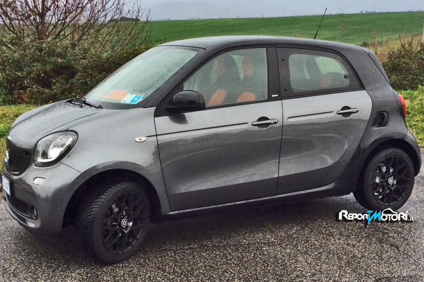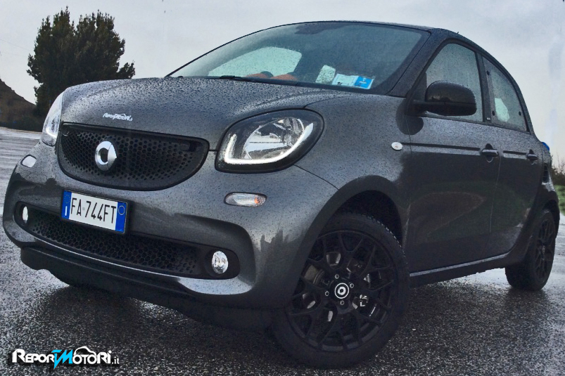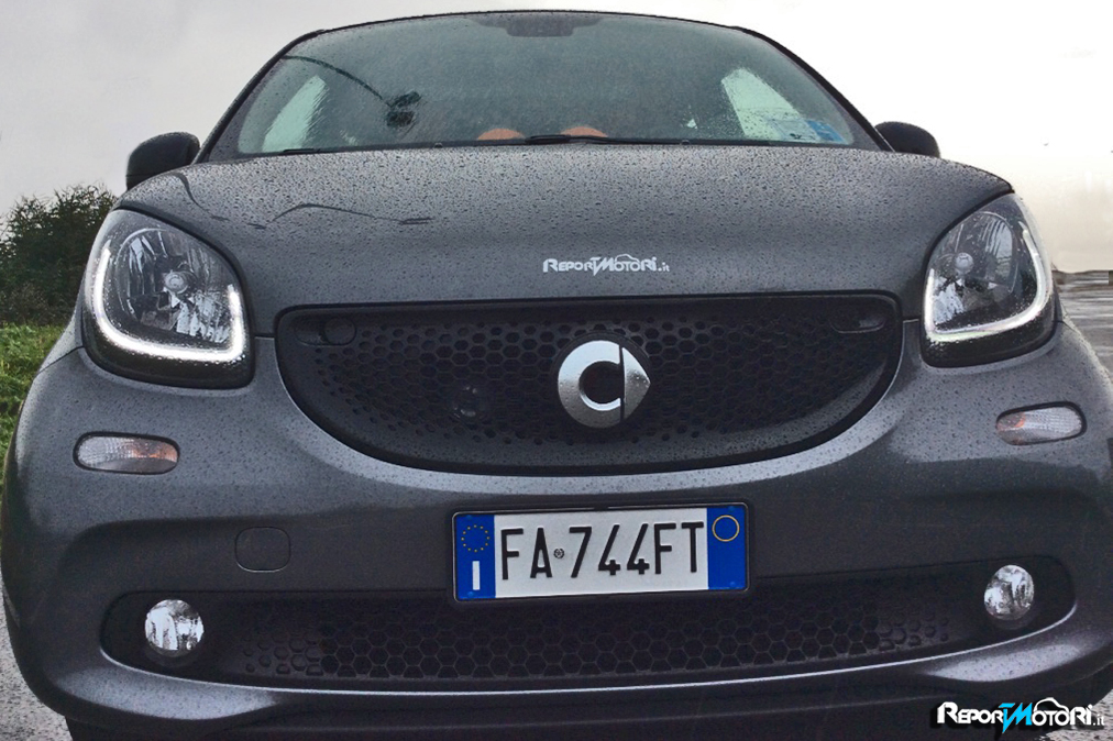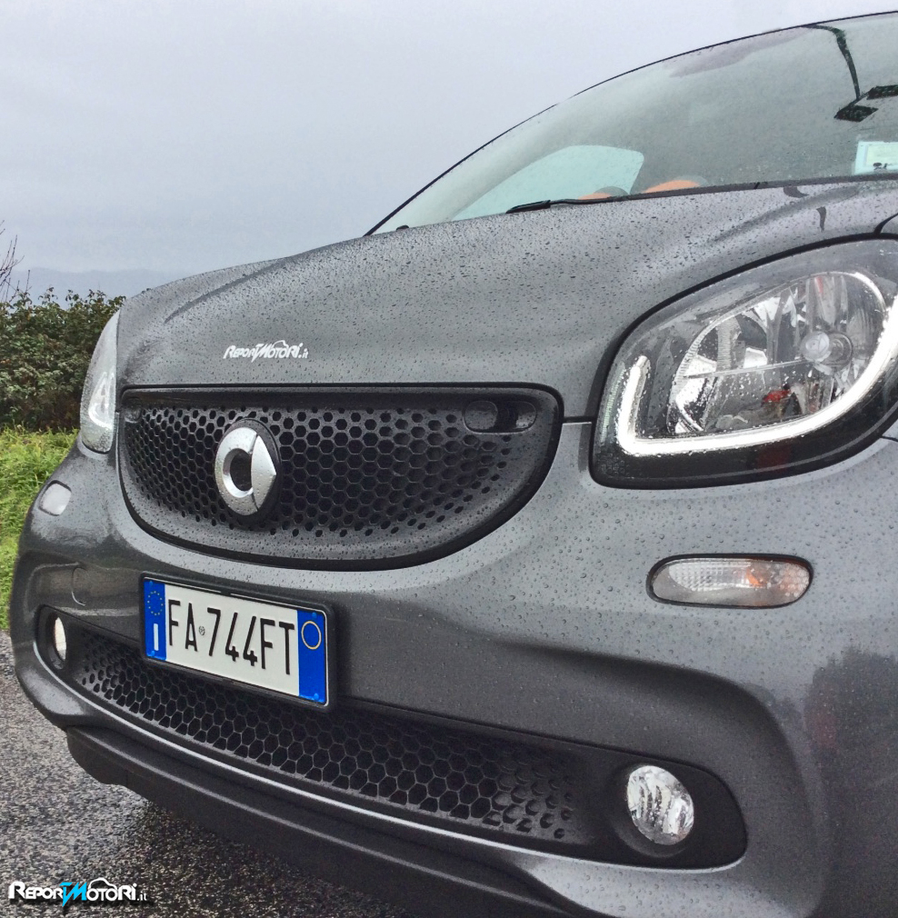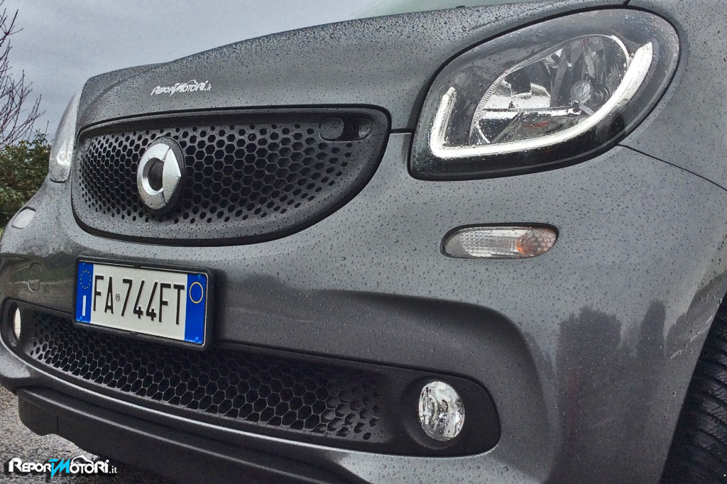 Proporzioni decisamente inusuali per la quattro porte smart perché ad un cofano anteriore decisamente alto e tagliato corrisponde una linea di cintura alta ed un notevole sviluppo in altezza del corpo vettura, del resto, l’obiettivo dei tecnici tedeschi era quello di aumentare l’abitabilità ed il comfort interno sfruttando al meglio i ridotti ingombri di un auto che non arriva a sfiorare i tre metri e mezzo di lunghezza !