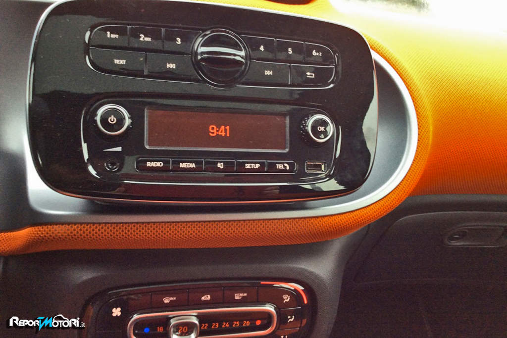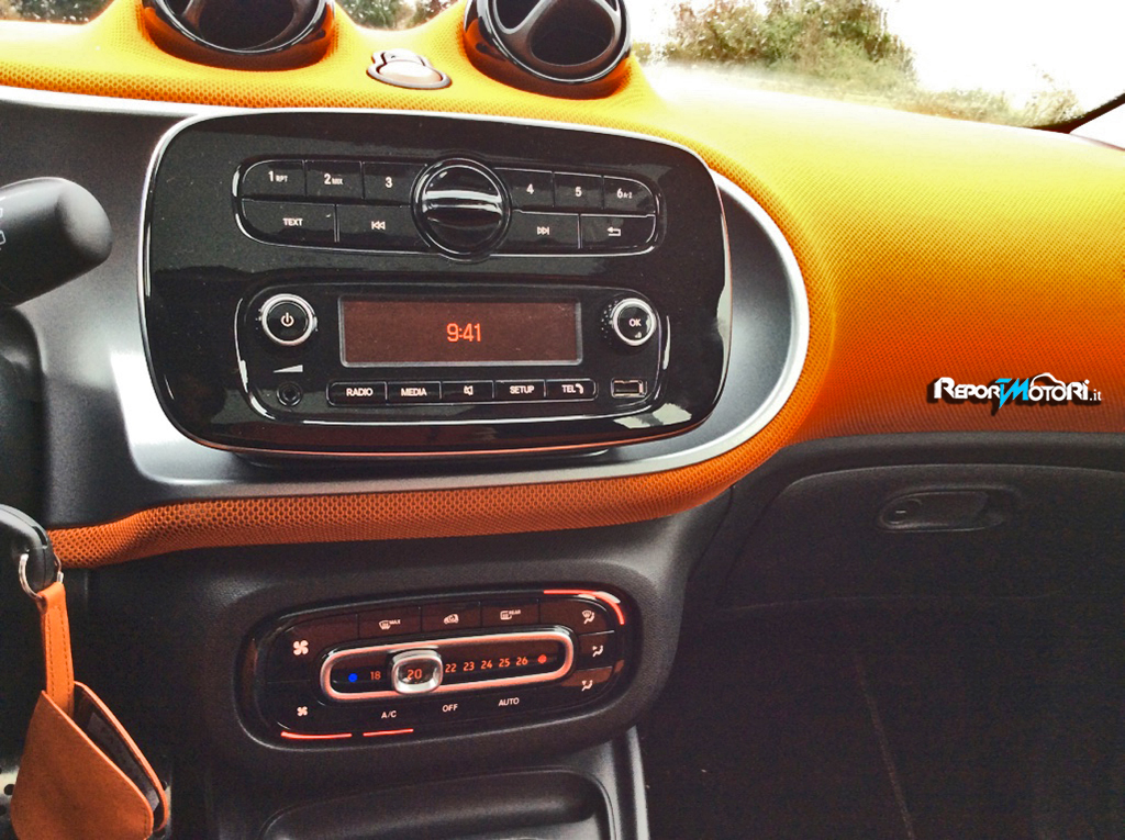Sulla smart forfour sport edition #1 è presente il climatizzatore automatico, veloce nel suo funzionamento ha una aspetto decisamente “ vintage “ forse su di una vettura di questo livello e target avremo preferito comandi digitali ed un aspetto notevolmente più tecnologico .