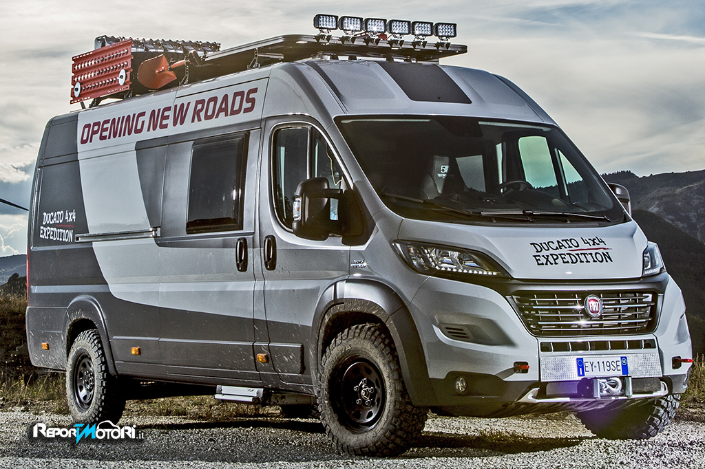Il frontale è dominato da fari con DRL a LED mentre il tetto presenta una dotazione completa per una vacanza al di la del convenzionale, spazi outdoor e contatto con la natura, questa è l’indole del Fiat Ducato 4×4 Expedition .
