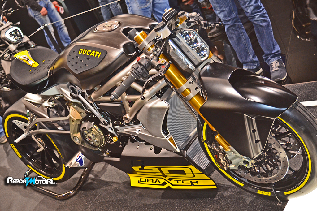 Sotto gli occhi dell’amministratore delegato Claudio Domenicali, che ha trascorso l’intera giornata in fiera, Ducati ha presentato l’inedita draXter, una “concept bike” che interpreta in chiave sportiva il mondo XDiavel. Il progetto è stato realizzato dall’area Advanced Design del Centro Stile Ducati, sezione dedicata a esplorare i futuri concetti di stile e design delle moto di Borgo Panigale. Oltre all’inedito concept e alle moto di produzione, XDiavel e XDiavel S , sono esposti gli accessori e l’abbigliamento dedicato alla nuova cruiser di Borgo Panigale.
