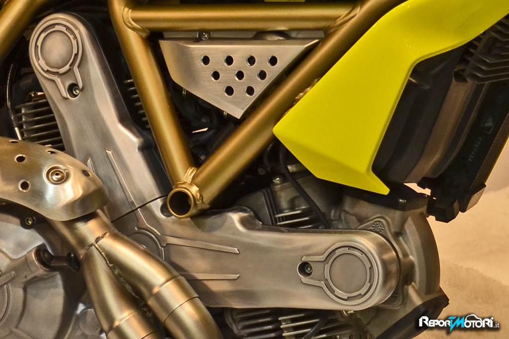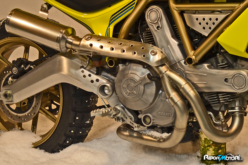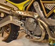 Gli accostamenti cromatici hanno una rievocazione storica, la Ducati Scrambler Artika si veste giallo fluo ed ha la grafica vintage in nuance di blu, un accostamento che lascia chiaramente intravedere quanta personalità possa avere una nuda ricercata e vestita in chiave Special .