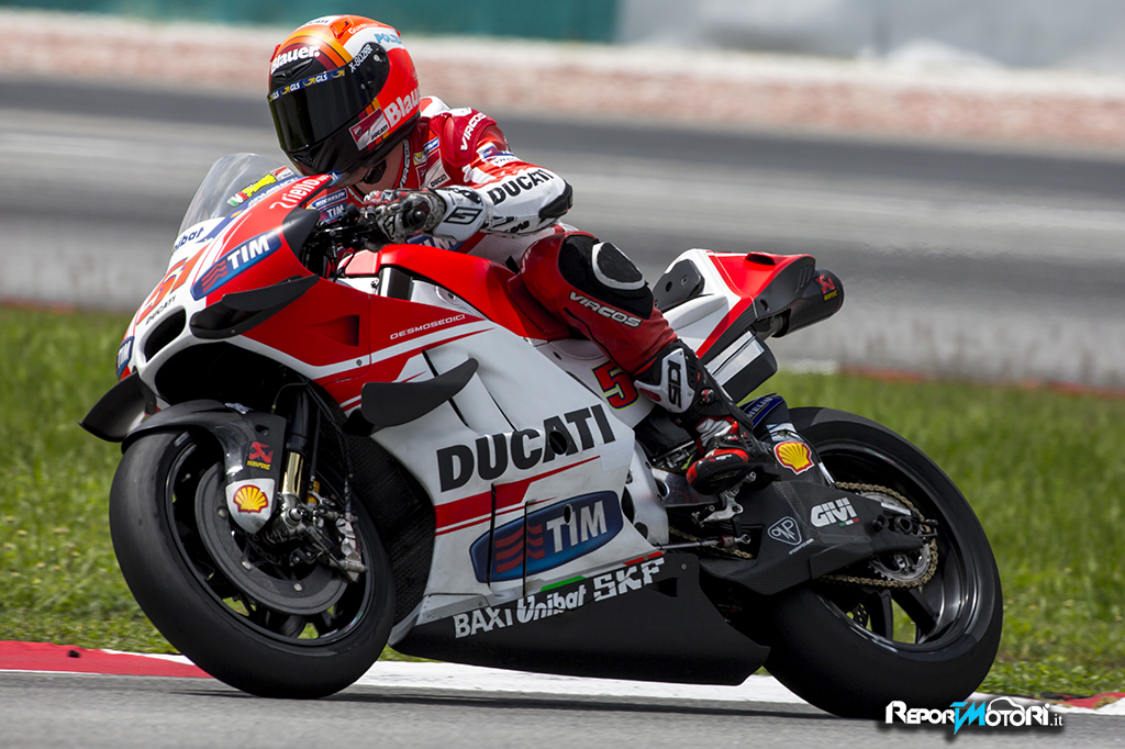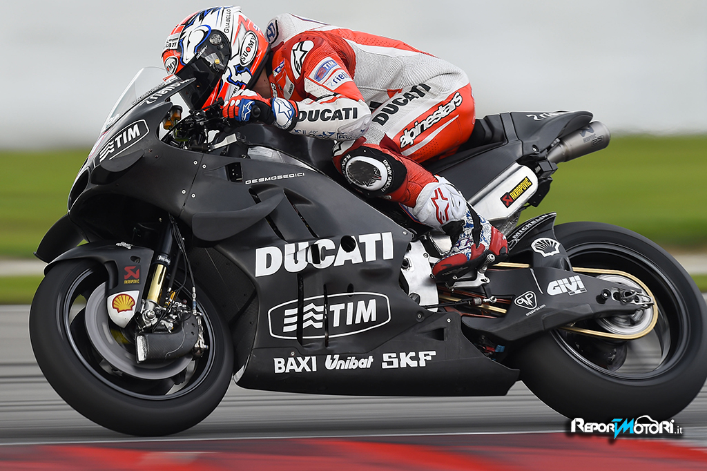 Il trio è sceso in campo, Andrea Dovizioso , Andrea Iannone e Michele Pirro hanno potuto saggiare le prime doti velocistiche ed i primi riscontri cronometrici della nuova Ducati Desmosedici GP, moto che in Malesia presentava carene completamente nere .