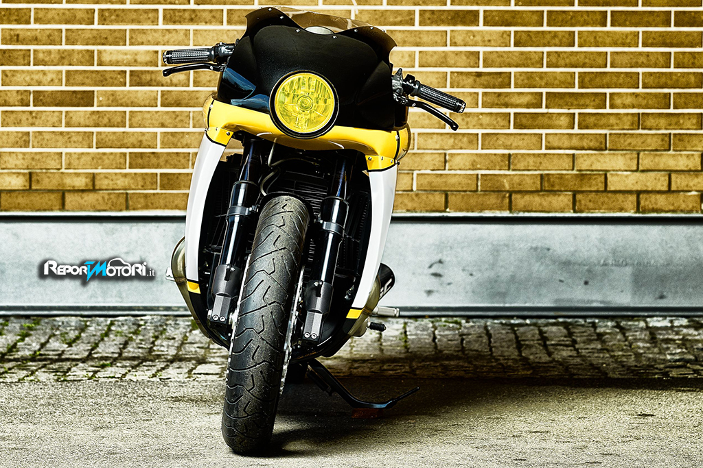 Monoscocca, serbatoio e codone artigianale e livrea classica stile anni ’80, con grafica bianco-gialla-nera, il ricordo delle Yamaha d’epoca qui è vivo, forte!