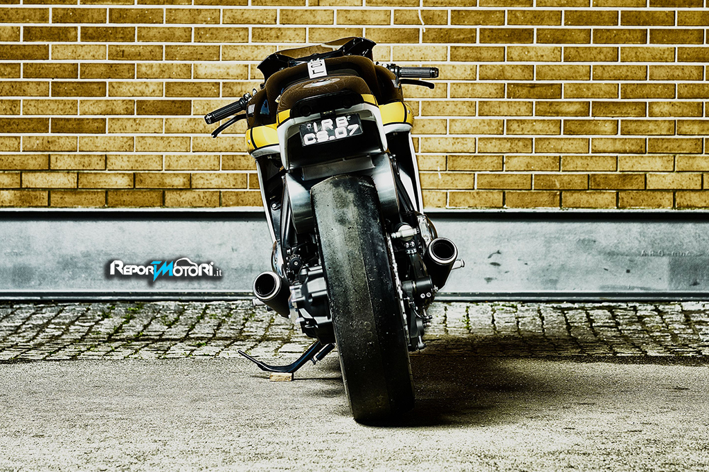 Il massiccio pneumatico posteriore slick ed i collettori in acciaio 4 in 2 sono solo alcune delle prerogative di una special che sposa la completa artigianalità, persino i cerchi a raggi sono realizzati a mano !