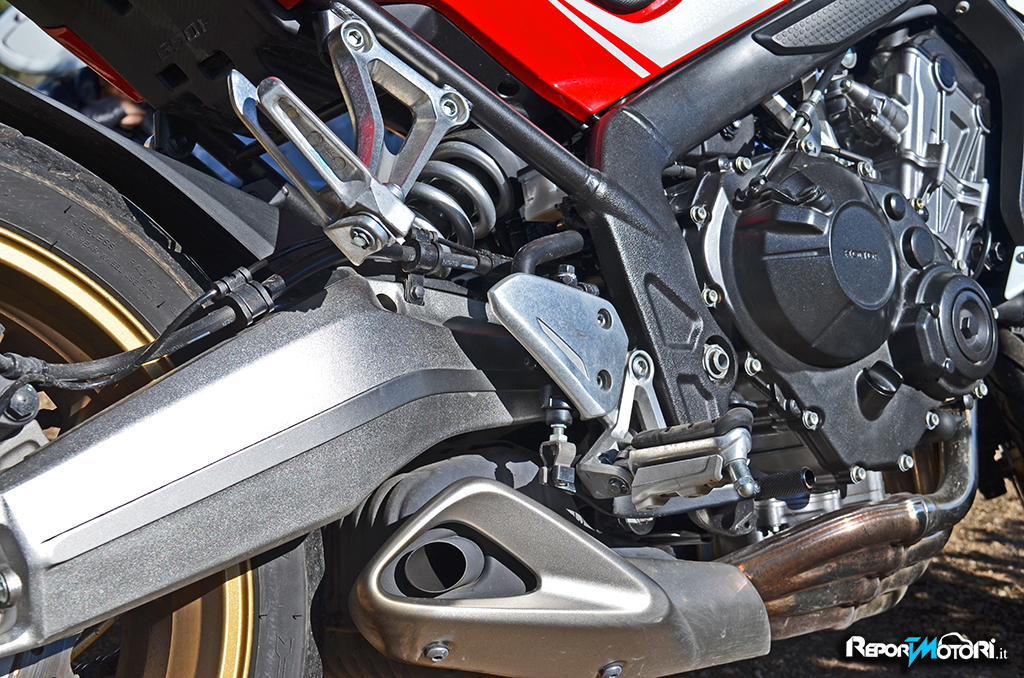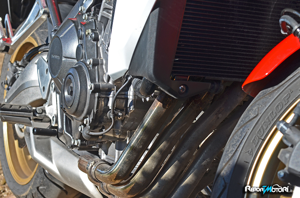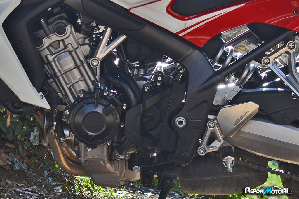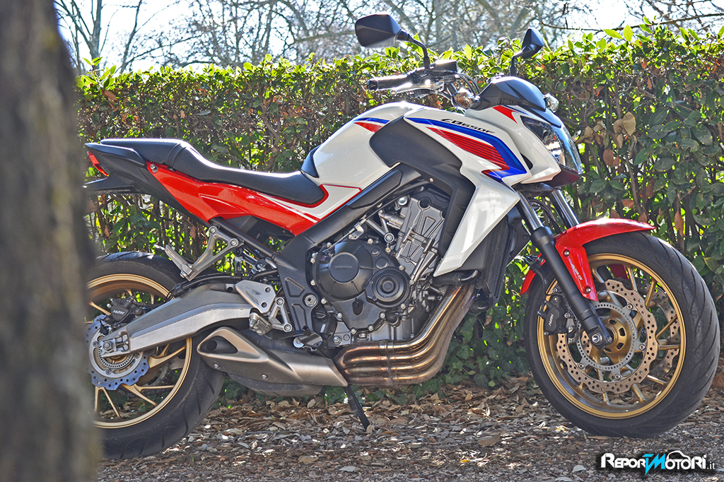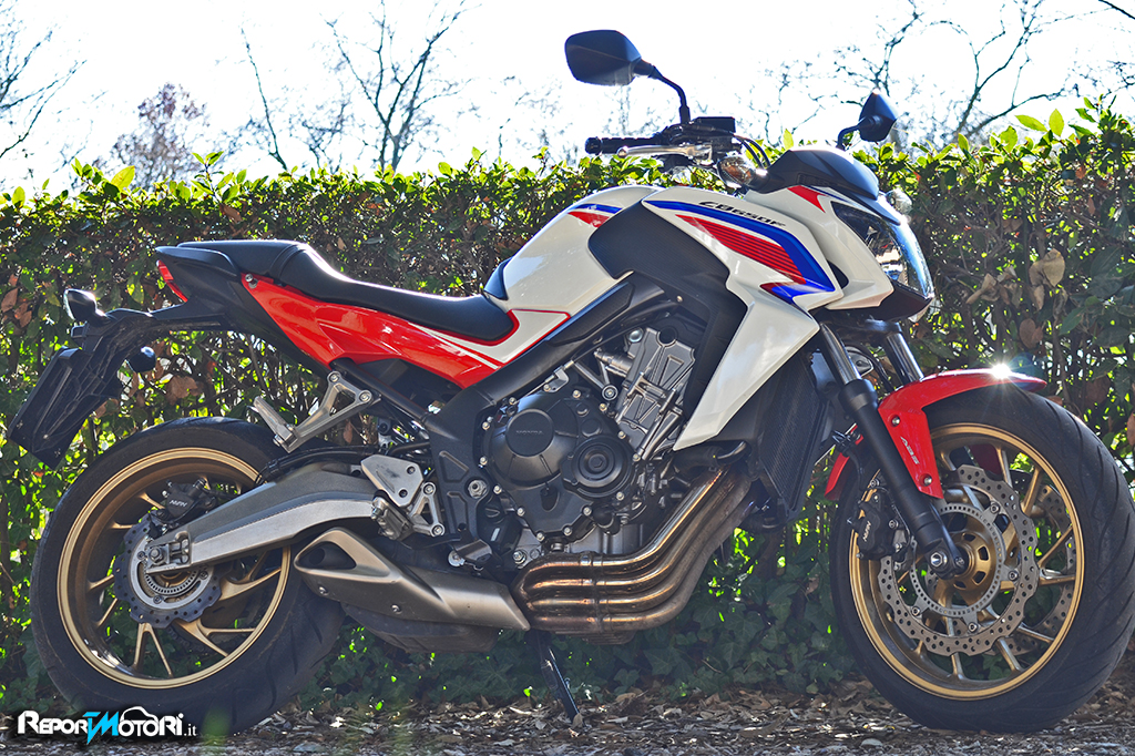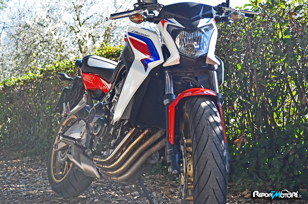 Il sound è discreto, il sistema di scarico 4-2-1 richiama quello della celebre antenata, l’erogazione privilegia la spinta ai medi, perché una naked nasce per divertire ed in effetti seppure sia una moto “ tranquilla” , la Honda CB650F mostra di gradire particolarmente il percorso misto.