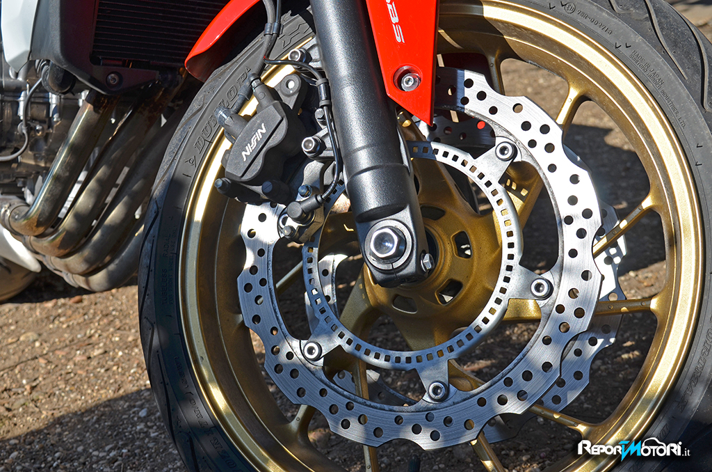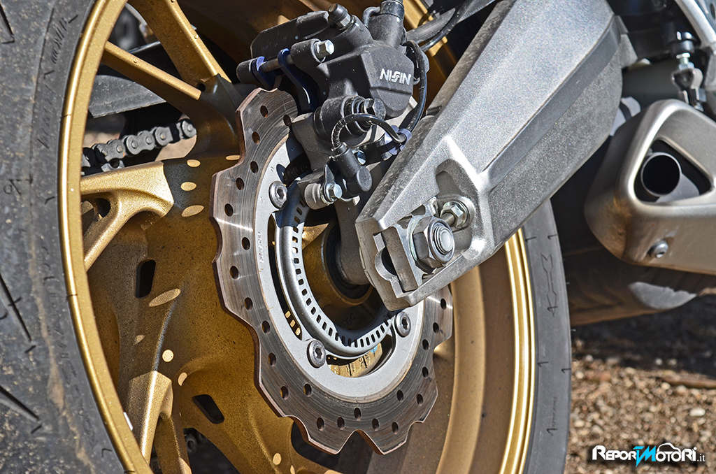 Belli i cerchi dorati a 6 razze che calzano pneumatici 120/70 e 180/55 ZR 17.