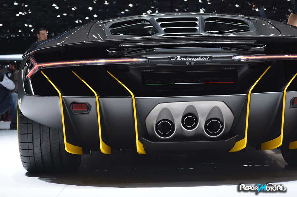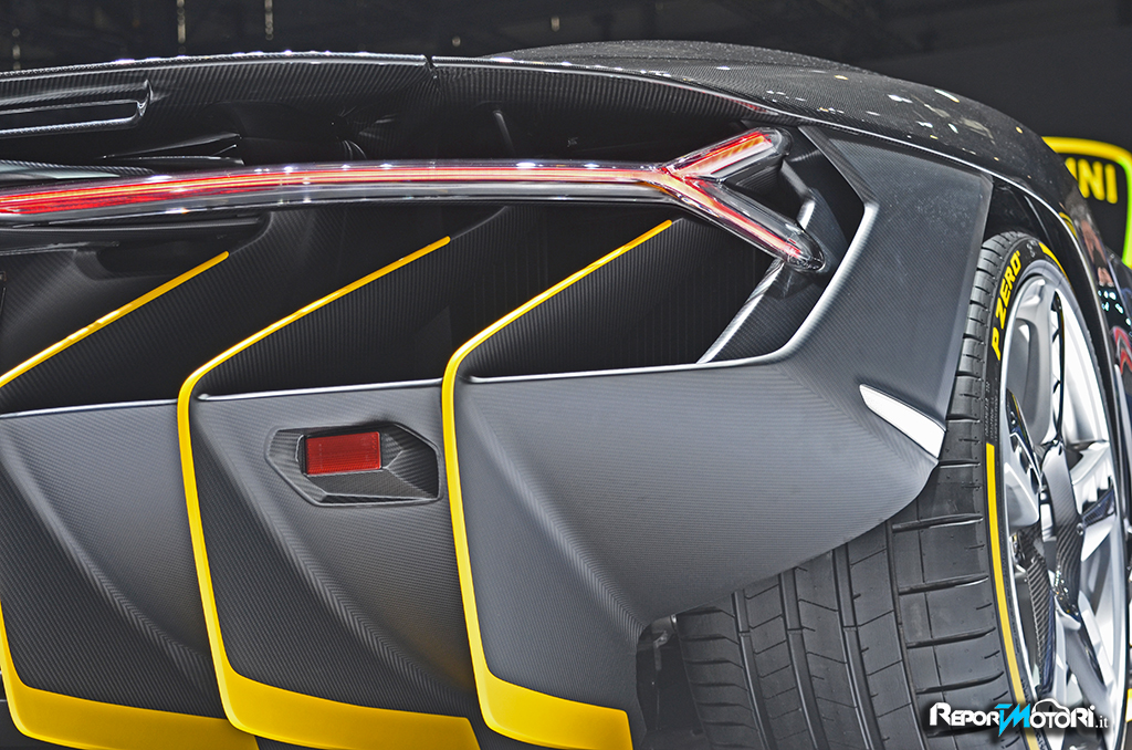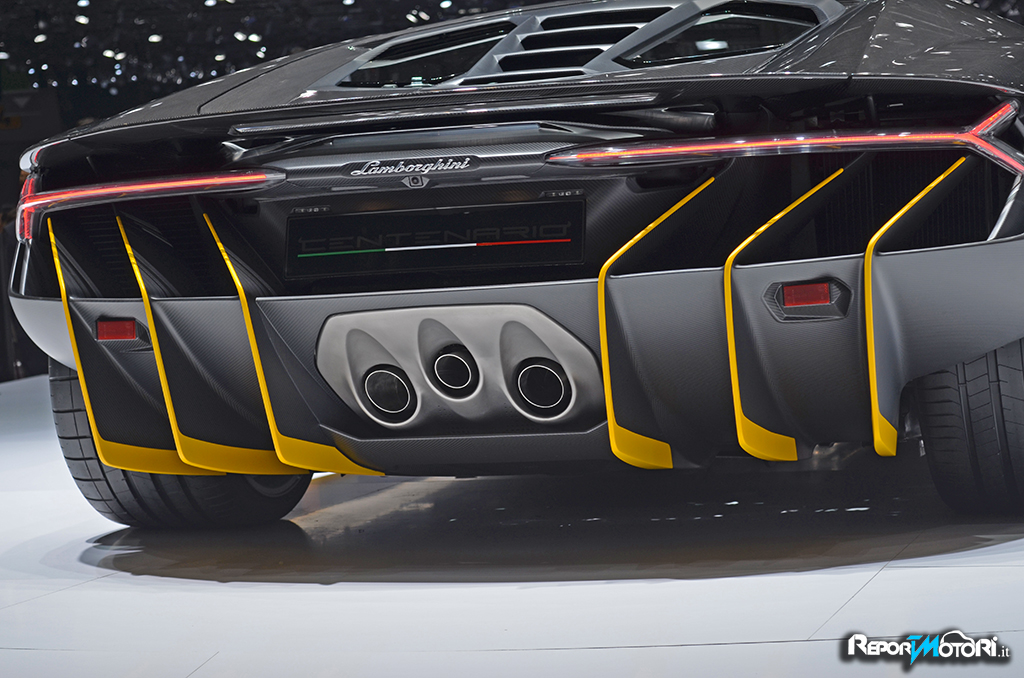 Lo spoiler posteriore estensibile è integrato nella carrozzeria a vettura ferma e a basse velocità per non alterare le linee minimali della Centenario. Tuttavia, in base alle condizioni dinamiche della vettura e alla modalità di guida scelta, lo spoiler si allunga di 150 mm e ruota di 15 gradi per un’efficienza aerodinamica ottimale in condizioni di prestazioni elevate.