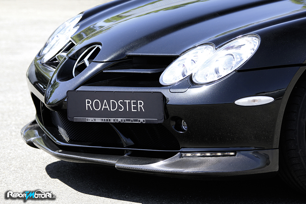 Allo scopo di dare maggiore sportività alla SLR, la Gemballa ha realizzato un sottile spoiler anteriore composto da un labbro in fibra di carbonio con finitura lucida, elemento che ne aumenta notevolmente l’aggressività estetica .