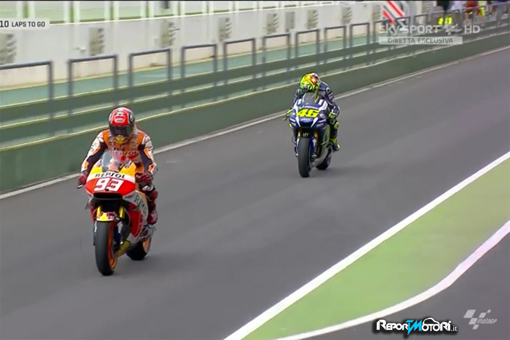 Alle spalle di Marc Marquez arriva Valentino Rossi, autore di una prima parte di gara da manuale, ma in netta difficoltà dopo il cambio moto .