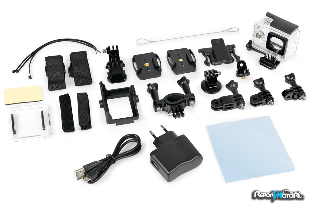 Ricchissima la dotazione di accessori: oltre al kit di montaggio, che consente l’installazione dell’Action-Cam su caschi, vetture, moto e mountain bike, troviamo anche l’utilissima custodia impermeabile che protegge la telecamera da spruzzi d’acqua e schizzi di fango, con una tenuta stagna garantita fino ad una profondità di 30m.