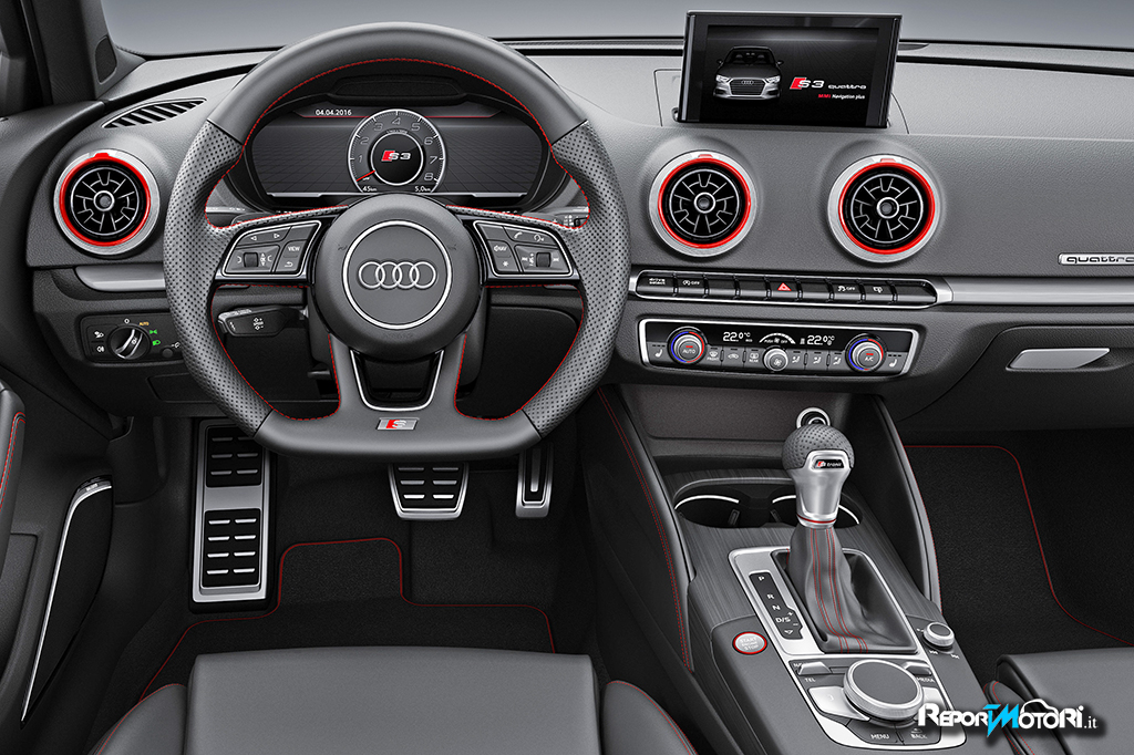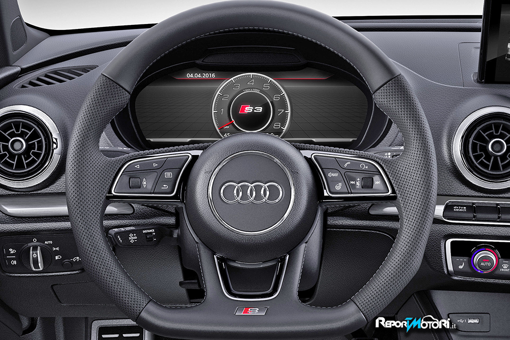 Importante highlight nell’abitacolo della nuova Audi A3 è rappresentato dall’Audi virtual cockpit. Questa innovativa tecnologia di visualizzazione è disponibile per la prima volta in un modello del segmento delle compatte. L’Audi virtual cockpit presenta le principali informazioni rilevanti per la marcia su uno schermo TFT da 12,3 pollici ad alta risoluzione.