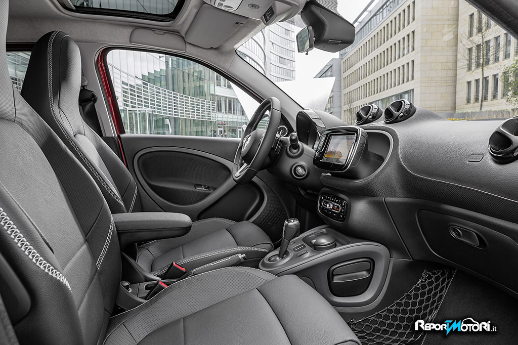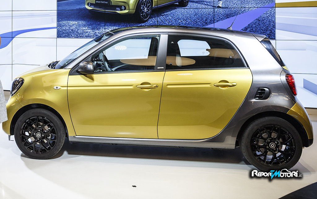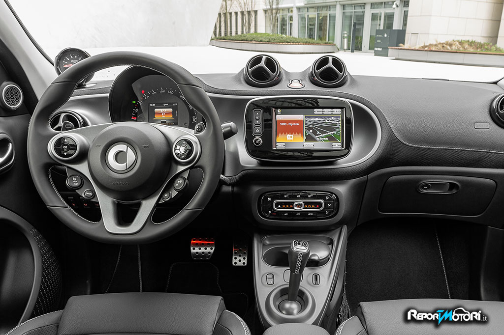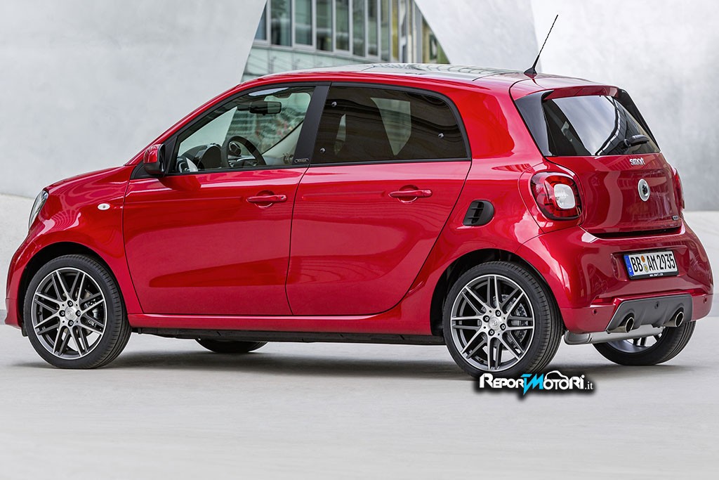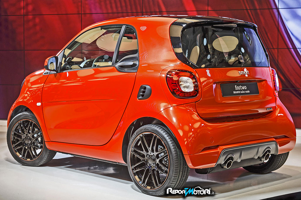Nella smart forfour le dimensioni sono invece di 185/45 R17 H (anteriori) e 205/40 R17 H (posteriori). Tutti i modelli smart BRABUS sono equipaggiati di serie con tetto Panorama, box portaoggetti con serratura, pacchetto Cool & Audio e funzione di avvertimento della distanza.