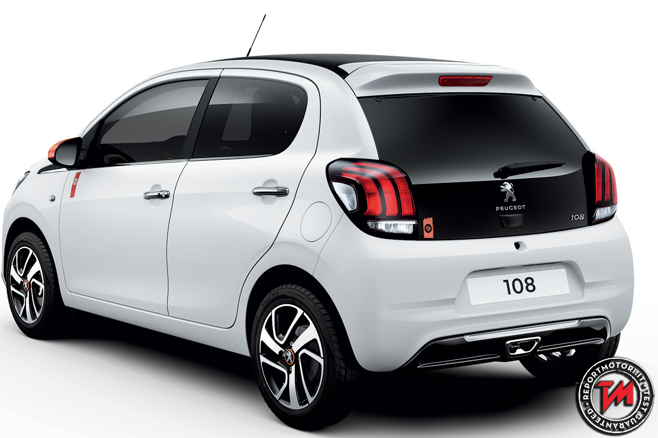Esternamente 108 Roland Garros Top! si distingue per: badge laterali e badge posteriore Roland Garros; calandra con scritta Peugeot arancio; cerchi Thorren da 15” con coprimozzo nero brillante e profilo arancio; profilo frontale del tetto arancio; guscio dei retrovisori arancio.